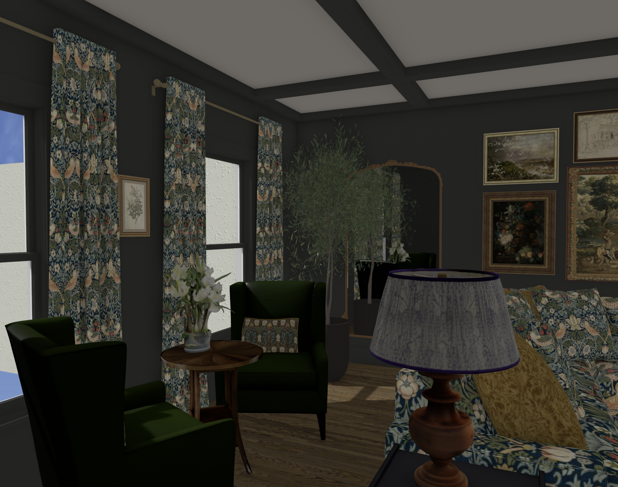 subtle evening sun light with shadows interior lights on