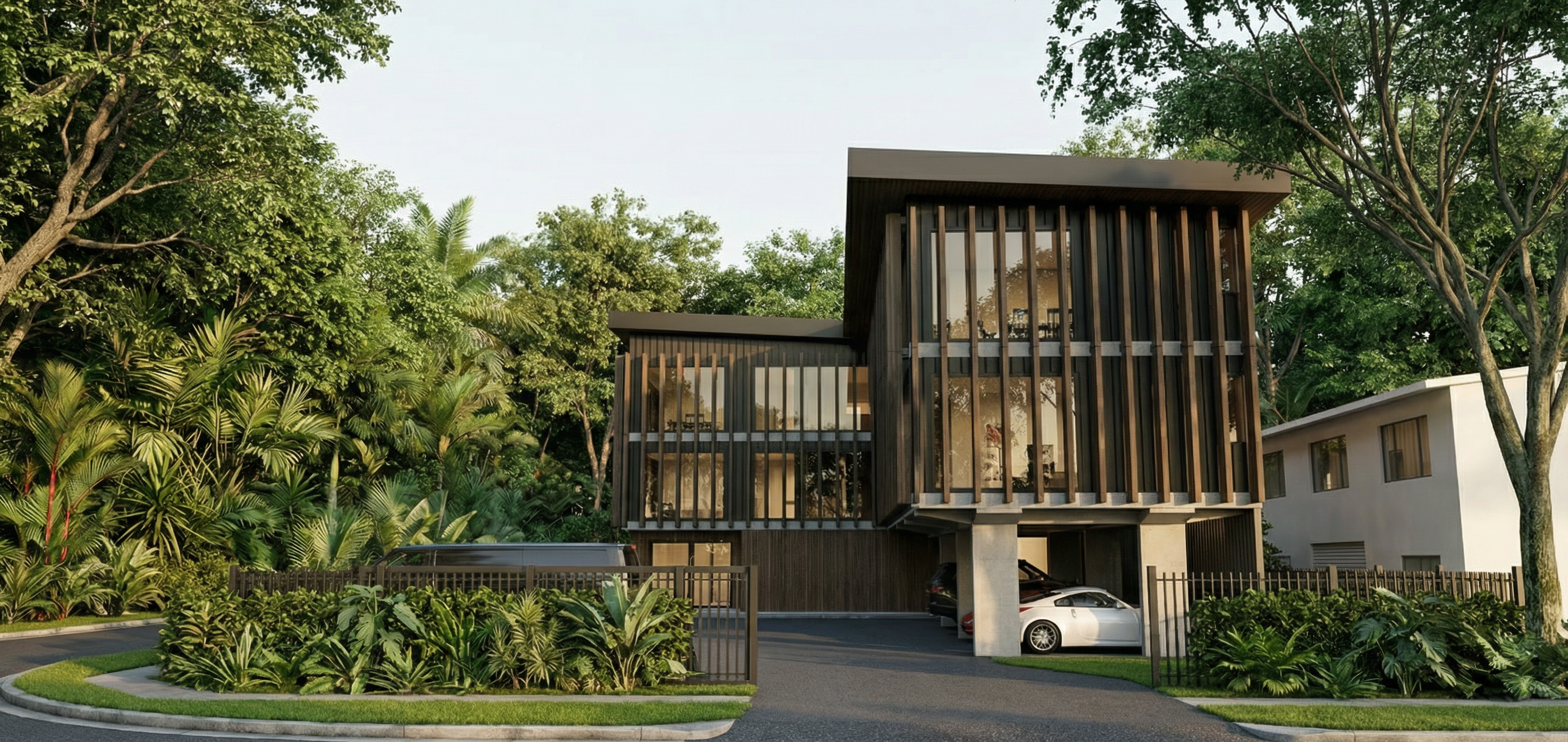 red multi stock brickwork laid stretcher bond open side timber framed porch with pitched gable roof timbers painted in white to match windows white painted upvc casement windows with astragal bars black front doors clay roof tiles in a warm red brown tone laid flat bonnet tiles on ridges roof lights only no dormers soft natural daylight with realistic shadows follow the drawing exactly ultra realistic textures architectural photography style remove all text from image sunny background simple white floral landscaping under windows small grass area with gravel paths up to front doors use traditional clay bonnet hip tiles along all hip lines of the roof