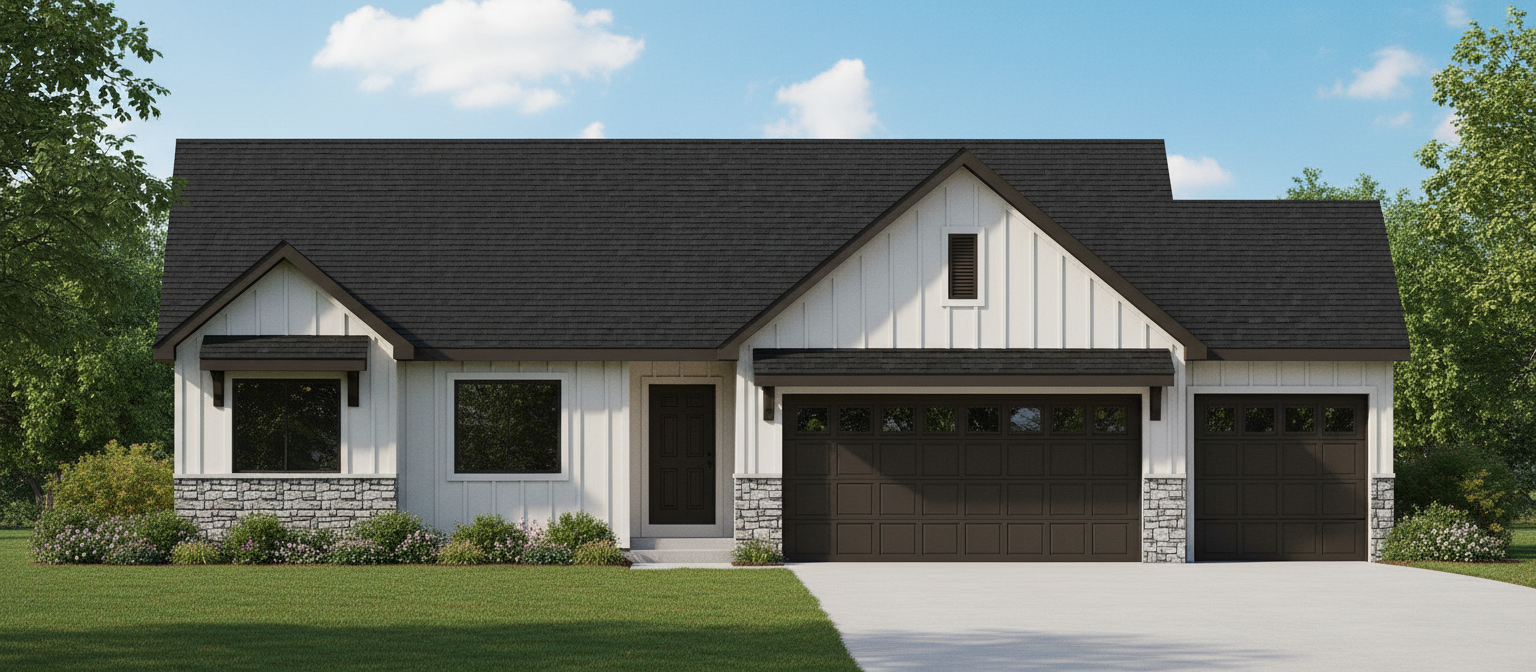 black roof black windows siding color is sw 7025 sherwin williams back drop garage door and front door are urban bronze color add trees and blue sky stone is centurion color texas ohio limestone remove front tree bigger driveway and no garage windows