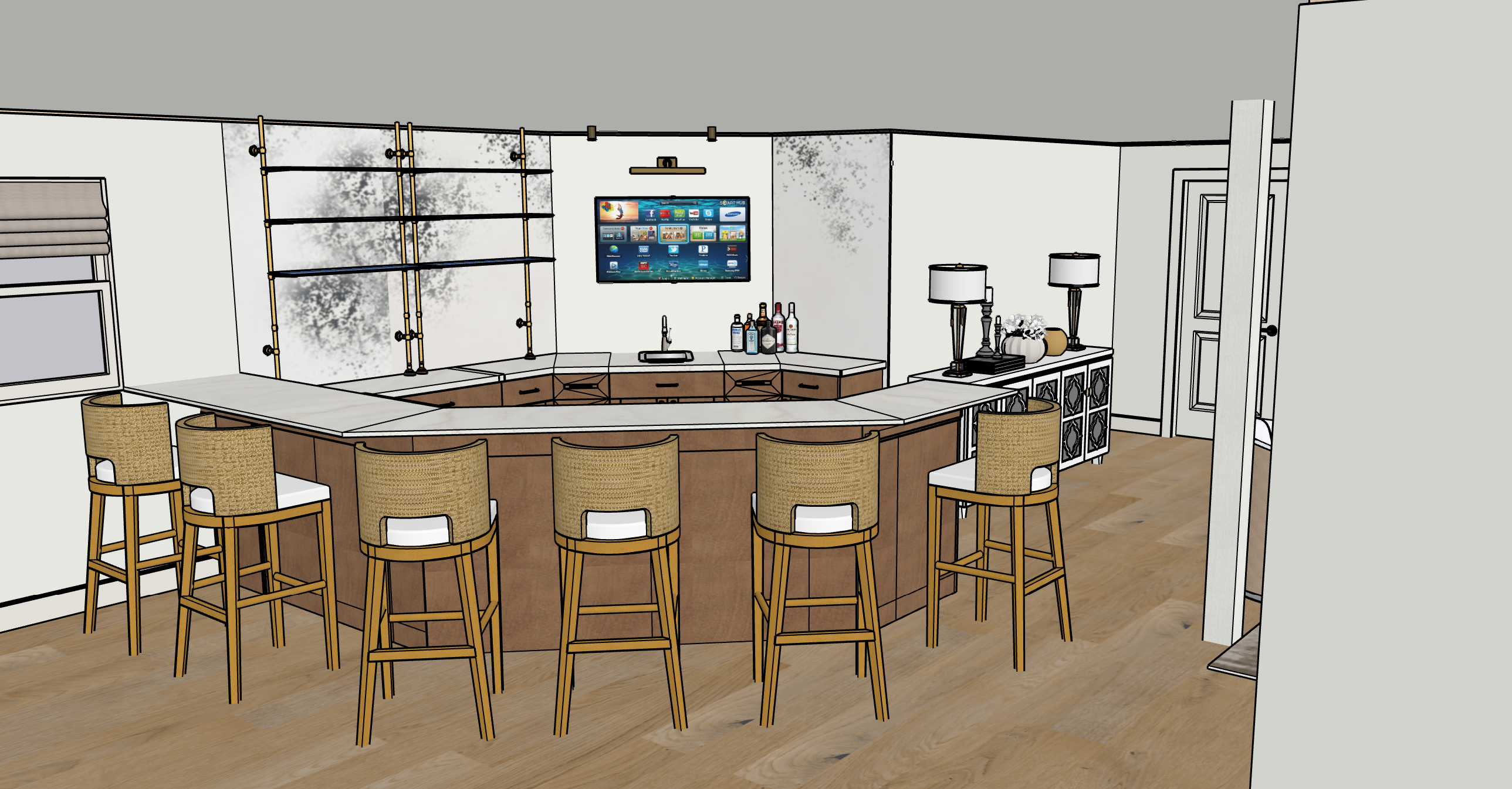 keep everything the same the floor is a oak luxury vinyl plank the bar cabinets are hazelnut maple the countertops are quartz the back splash behind the shelves tv and right side of tv is distressed mirror the walls are white and the trim is white the outside environment is a back yard with trees deck and iron fence the door is solid white the mirror reflection is a room with white walls and sectional