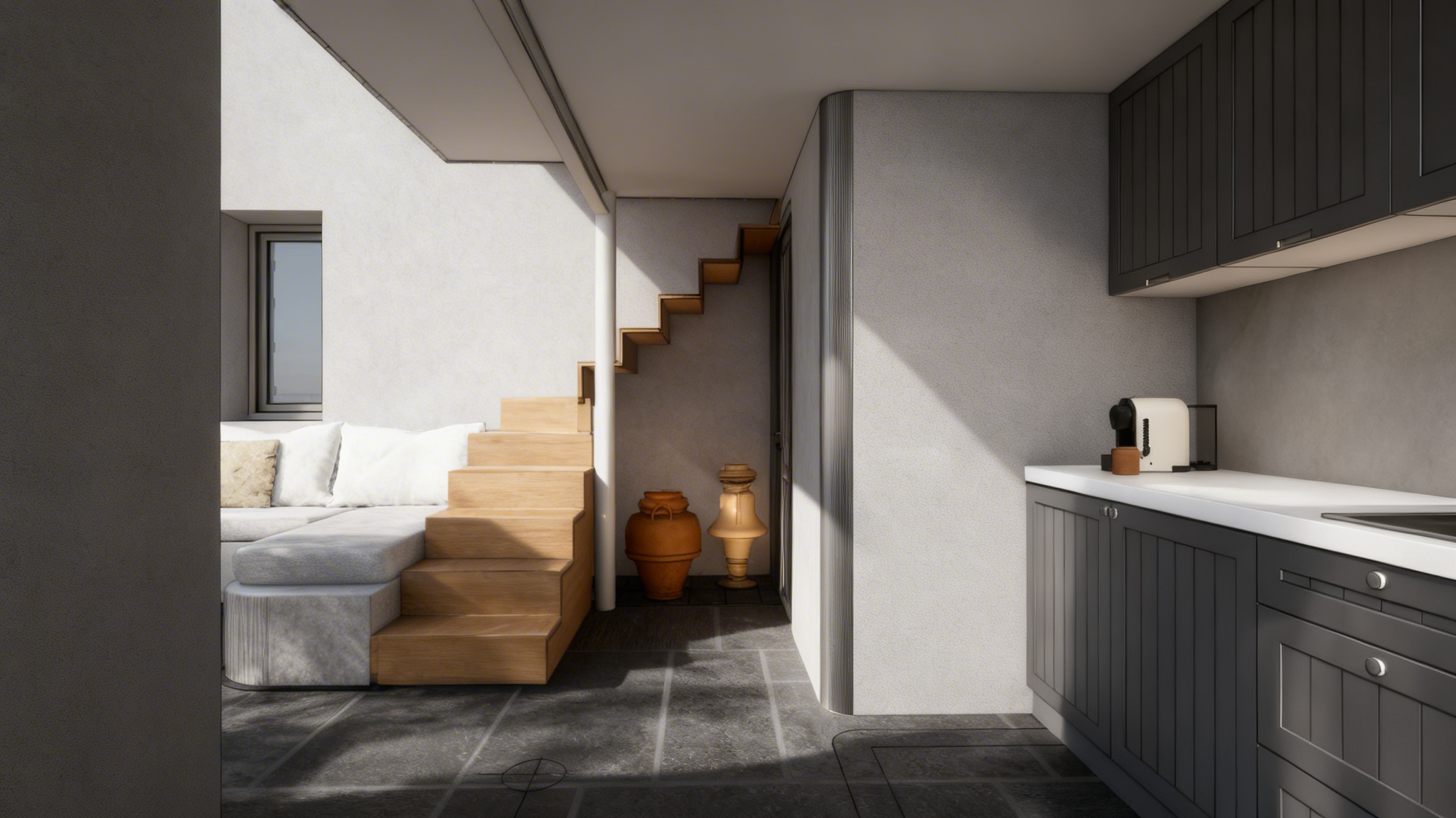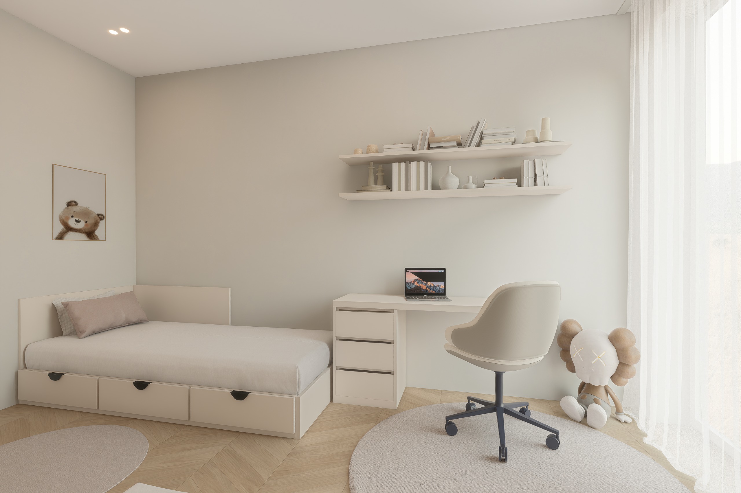 ultra realistic render of a soft modern kids bedroom keeping the exact same design layout camera angle proportions and furniture placement from the uploaded image do not change the design keep the room in a warm light cream and beige palette with smooth matte finishes on the wardrobe desk shelves and bed frames preserve the built in wardrobe on the right the single bed with storage drawers the desk by the window the rounded white chair the floating wall shelves the round rugs and the light herringbone wood floor exactly as shown make the scene look like a high end photorealistic interior photo with soft natural daylight coming through the large window and sheer curtains balanced with subtle warm ceiling spotlights improve realism of the fabrics curtain texture matte furniture surfaces floor grain shadows and reflections keep the bedding minimal elegant and realistic in soft neutral tones make the room feel clean calm premium and lived in but not cluttered add only very subtle tasteful styling if needed keeping the exact concept intact important do not alter the room dimensions wardrobe size bed shape desk design shelf placement or overall composition do not redesign anything only increase realism material quality and lighting negative prompt redesign change layout change furniture different colors dark room excessive accessories toys everywhere messy styling change wardrobe handles change flooring pattern replace curtains remove furniture different camera view distorted proportions oversaturated lighting blurry render low detail cartoon look if you want it stronger use this ending too make it look like a real luxury residential interior photograph extremely realistic materials soft atmospheric daylight clean premium styling sharp detail natural shadows no cgi look