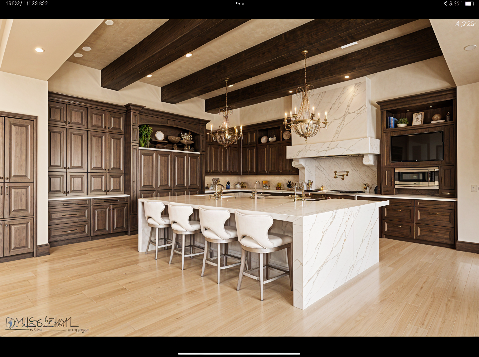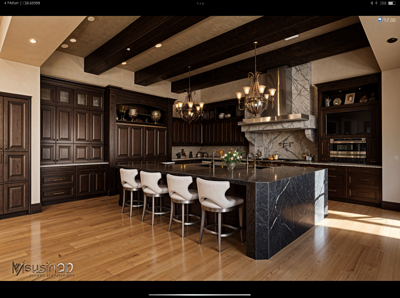 design a striking high end kitchen featuring a wow factor waterfall edge island made of dark natural stone with beautiful veining reflecting a super modern luxury aesthetic include a modern hood vent made that has light cream beige natural stone cover with no ornate detail add a matching stone backsplash for a cohesive elegant look
