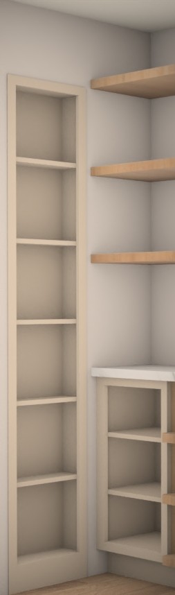 add expensive walnut boxes with root veggies to the open base cabinet at bottom right add pantry decor to other open shelves