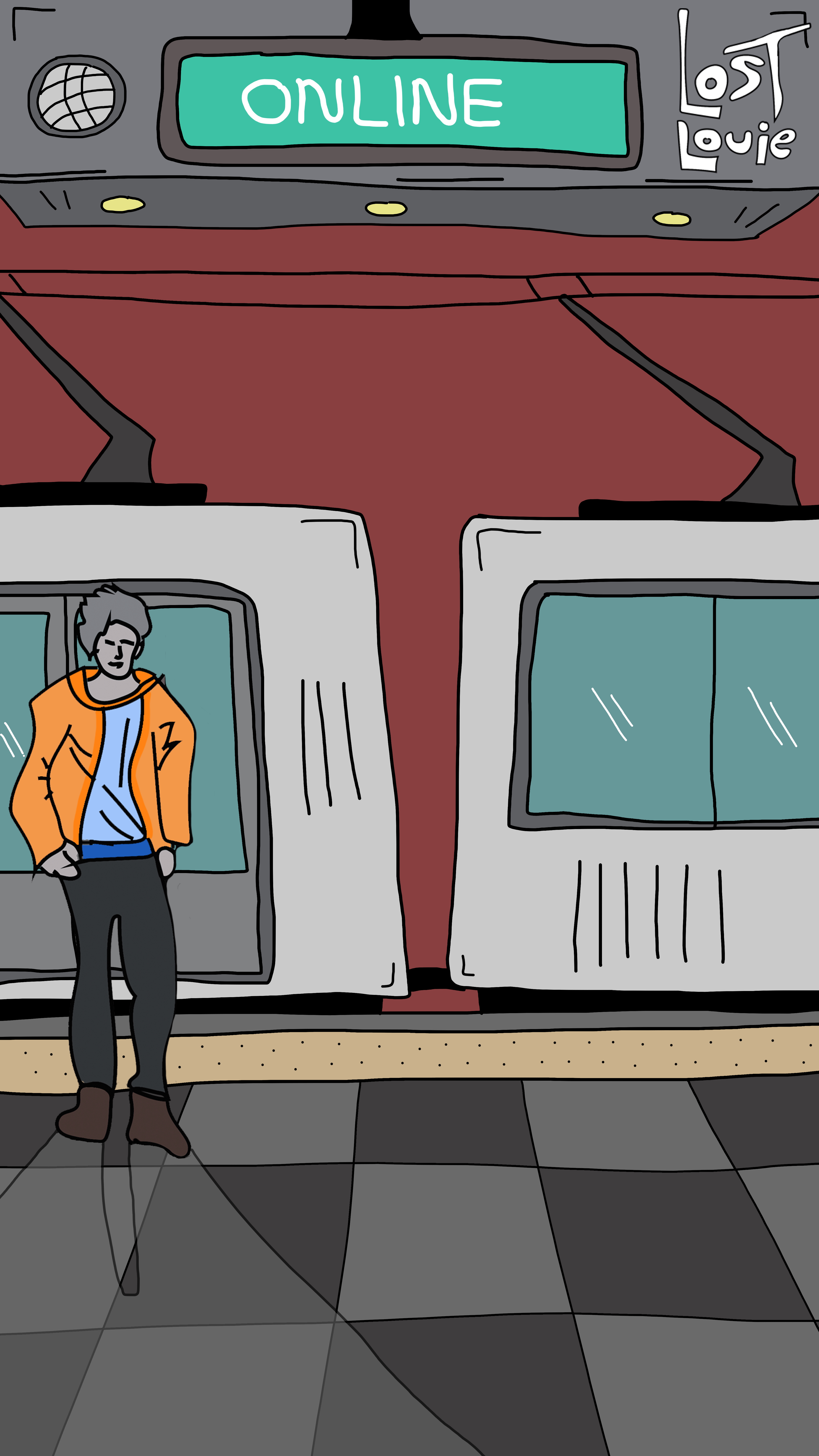 a futuristic subway station with a digital sign reading online the station is painted in deep maroon with sleek metallic accents soft warm yellow light emanates from overhead lamps casting gentle glows on the platform and walls a stylish figure stands casually wearing an orange jacket over a sky blue shirt contrasting against dark charcoal pants and brown boots the train is sleek and modern with silver metallic exteriors and windows that reflect the turquoise luminescence of the sign the floor tiles are a mix of cool greys adding depth and texture the atmosphere is sleek and modern with a touch of urban sophistication