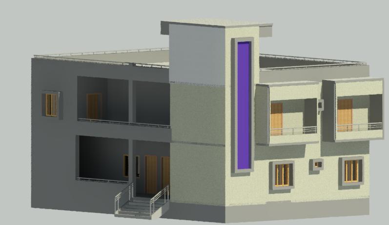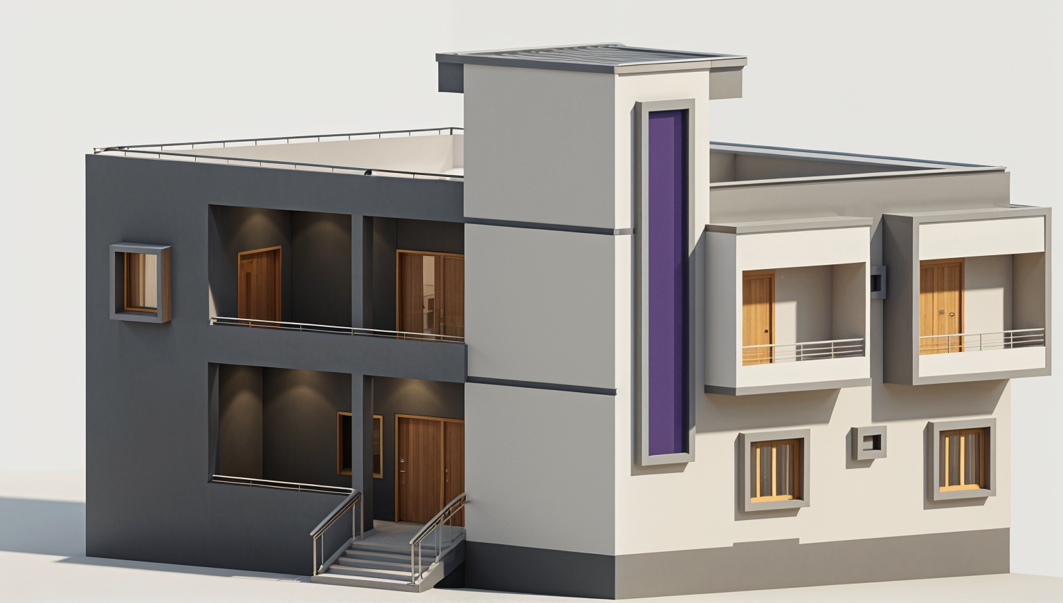 a two story modern house with a minimalist design featuring light gray and dark gray exterior walls the right side of the building has a striking vertical stripe in vibrant purple windows and doors are accented with warm wooden textures the atmosphere is serene and peaceful with soft lighting that highlights the architectural details the overall setting is urban yet tranquil conveying a sense of contemporary elegance and sophistication