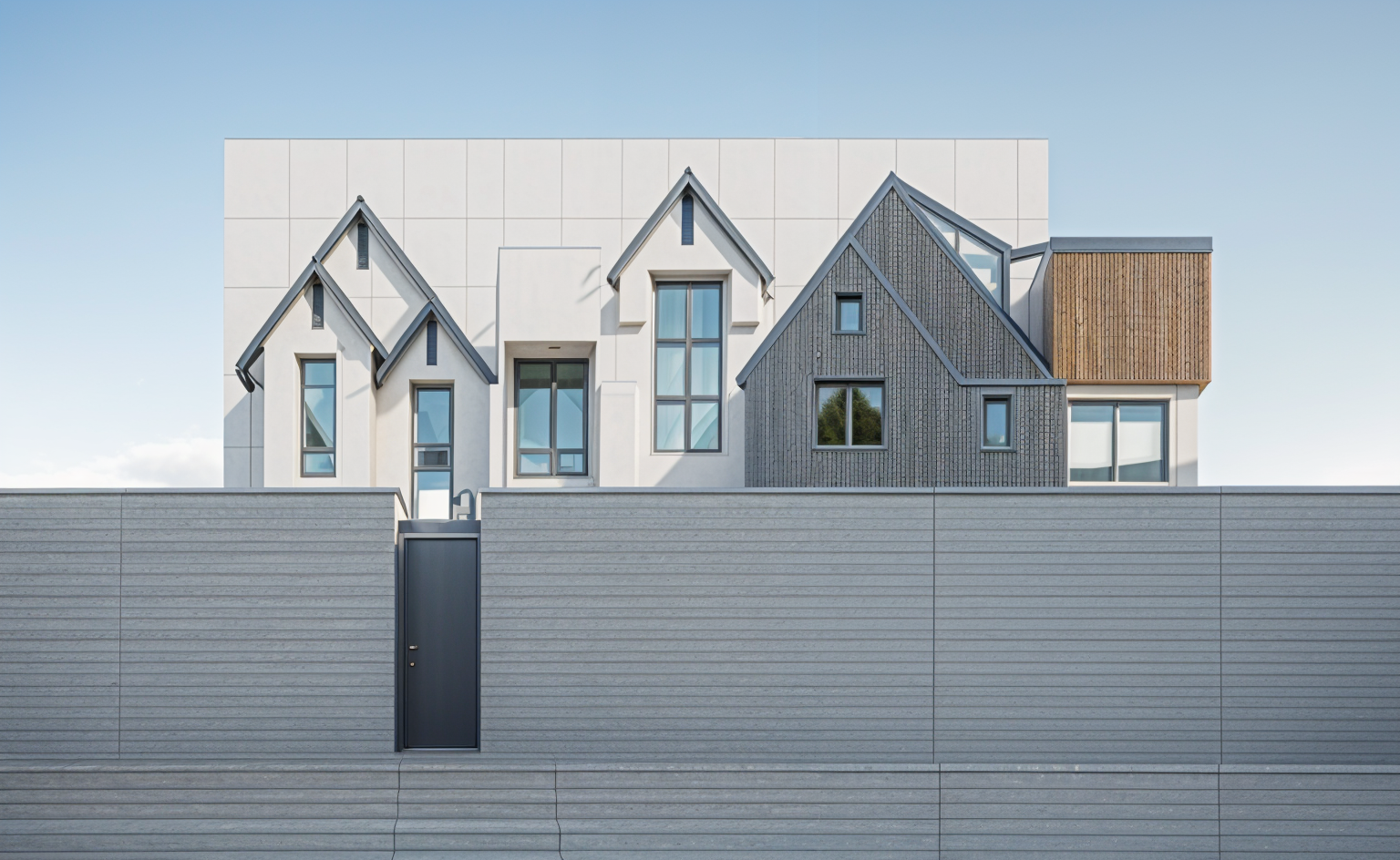 modern exterior shot white house with grey accents add lush green grass in the front with a sidewalk and driveway from single car garage architecture