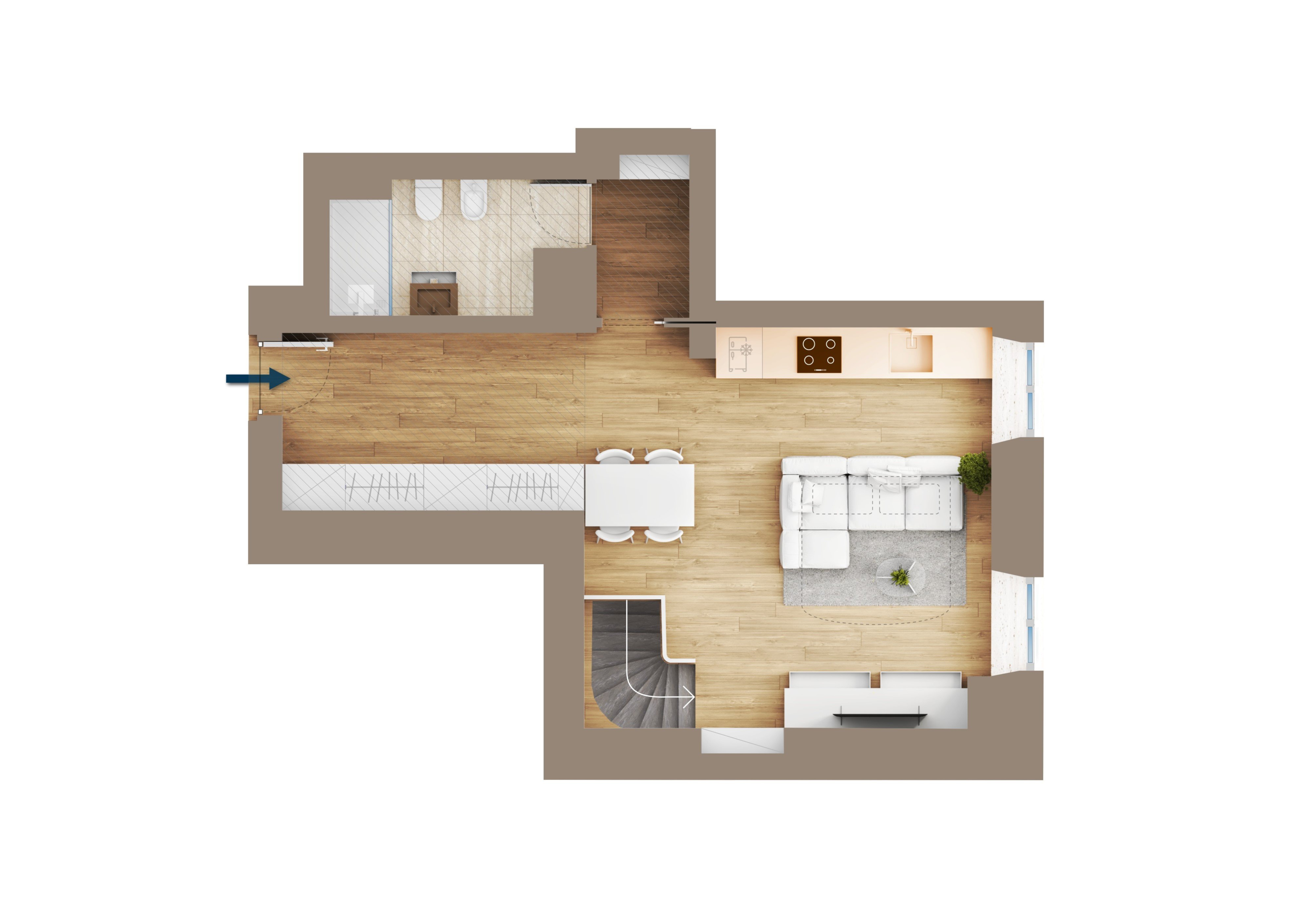 convert this floor plan into a realistic isometric 3d view of a full house show the space from an elevated angle with furniture walls and details visible sfondo bianco use the same furniture as shows on the plan do not change the orientation of the floorplan