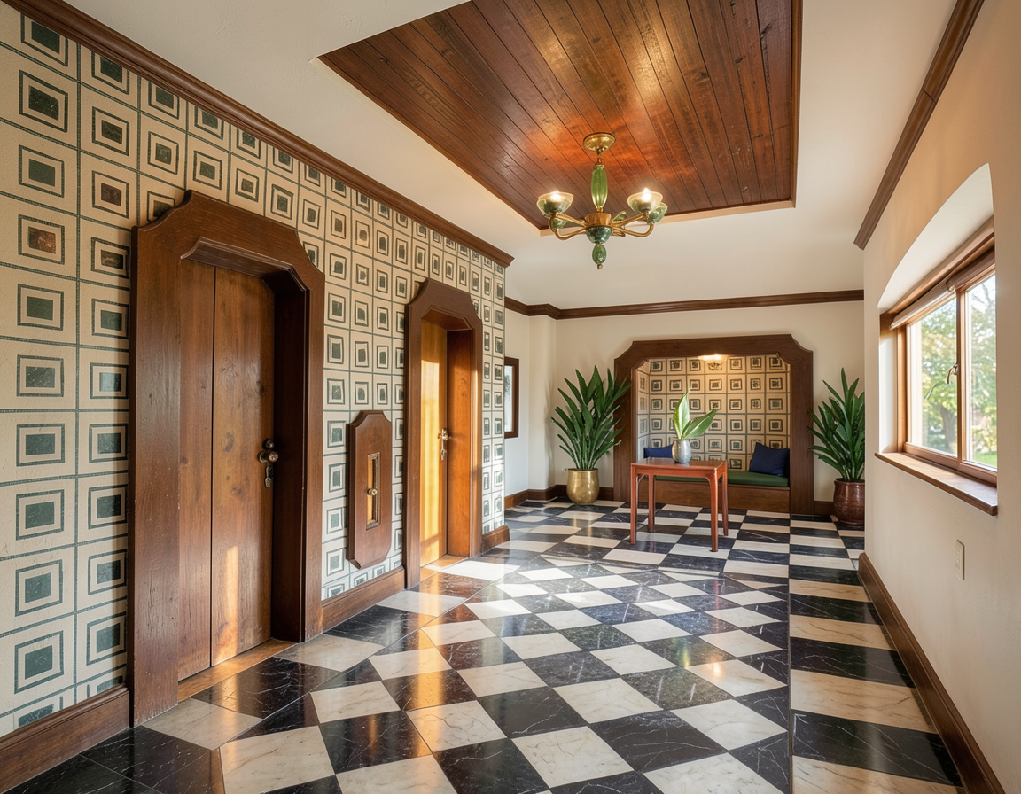 render this more photo realistic with natural light keep original materials and textures the top is a dark brown walnut the drawers are cognac brown leather and the shelves are blackened iron do not change anything
