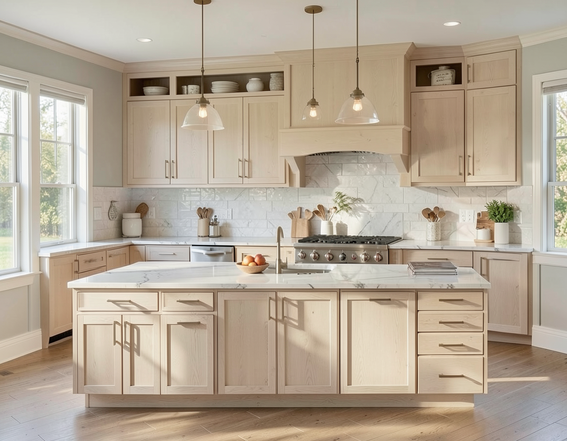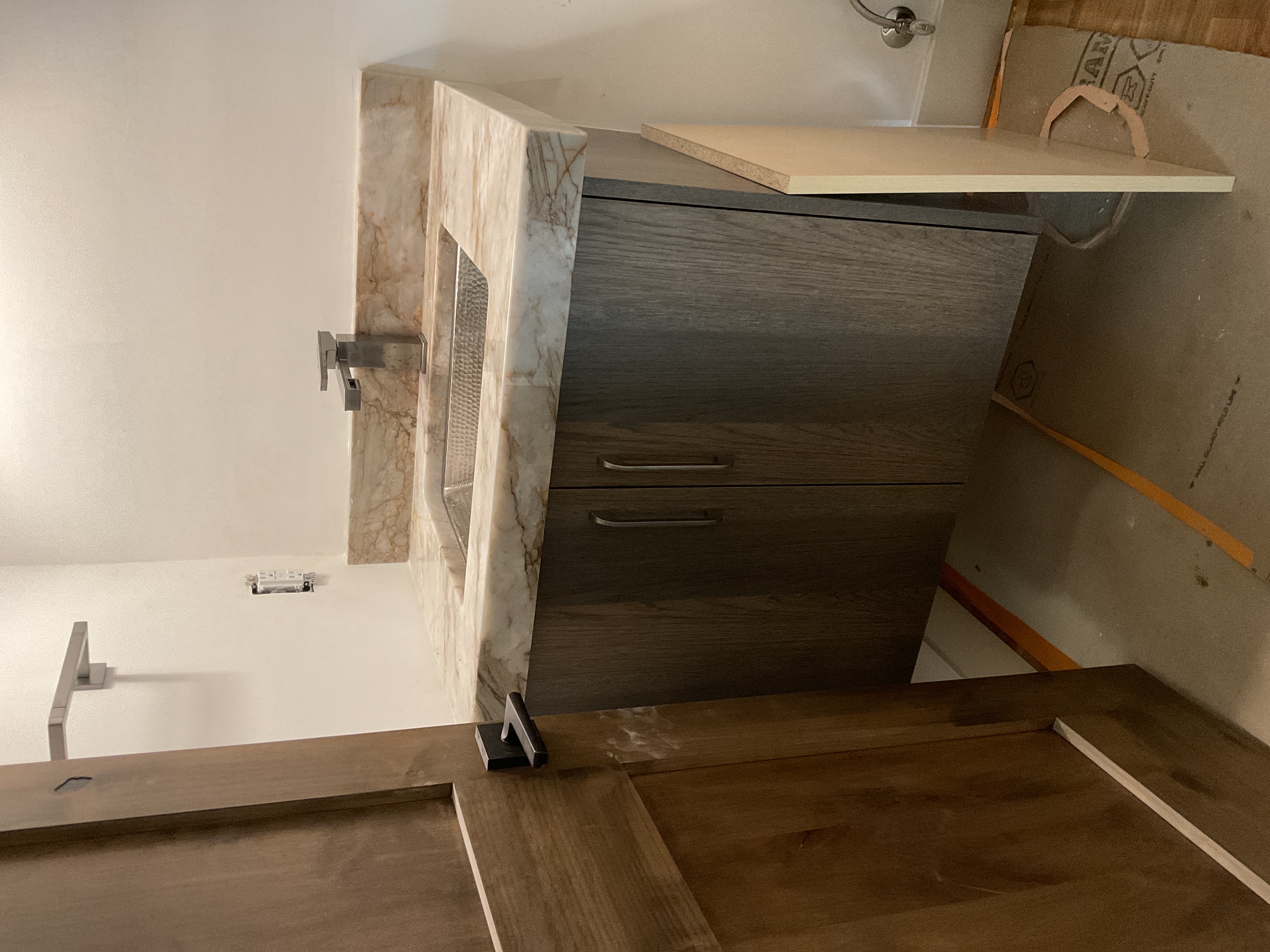 do not change the cabinets in any way preserve the exact cabinet colors materials finishes dimensions door and drawer styles hardware spacing alignment and all geometry exactly as shown do not alter the countertop shape backsplash appliances flooring lighting fixtures or wall structure only remove the construction materials clutter and mess from the scene clean the room and make it look finished and staged add a few simple tasteful home accessories appropriate for the style of the space but do not add or remove any furniture windows or architectural elements maintain the original lighting direction and realism enhance clarity and polish the photo while keeping the cabinetry and room design completely unchanged do not alter the lighting to keep the cabinet colors as they are in the image add new flooring add a decorative mirror with lighting stage the countertops for a bathroom vanity remove the door on the left put a towel on the rod