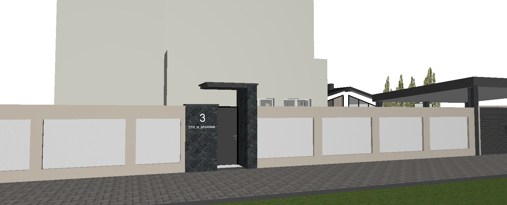 modern residential entrance gate minimalist design dark metal gate with stone frame warm indirect led lighting integrated in horizontal canopy above the gate soft linear light 3000k hidden light source subtle glow washing down the wall realistic light spill on pavement evening or dusk lighting high end architectural visualization ultra photorealistic soft shadows global illumination physically accurate materials clean composition cinematic rendering no overexposure realistic textures contemporary architecture muted color palette