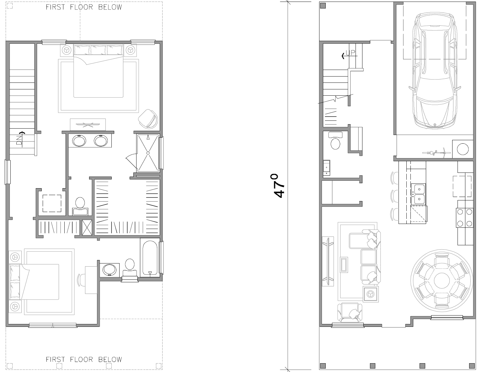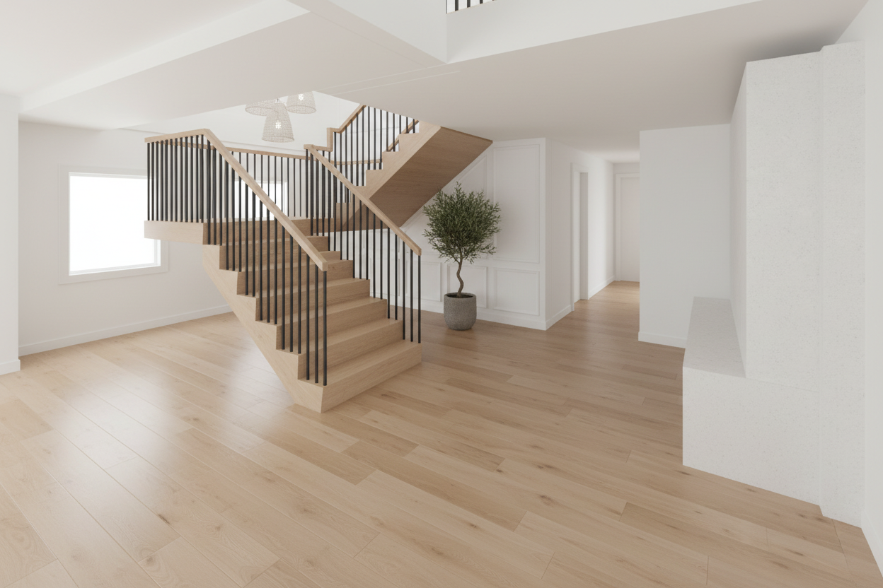 you are given an existing black and white architectural floor plan image absolute rules do not violate do not change the layout in any way do not move resize add or remove walls doors windows stairs or rooms do not alter dimensions scale or proportions do not move resize add or remove any furniture treat the plan as architecturally locked and construction accurate any geometric change is a failure your task keep the floor plan exactly the same only enhance the visual appearance using color materials and subtle styling flooring light natural oak wood flooring in all living areas bedrooms kitchen dining halls and closets light gray tile in all bathrooms smooth gray concrete in garage front porch flat matte finish only no patterns no gloss no dramatic contrast furniture keep all furniture exactly where it is do not change furniture shapes sizes or locations apply a west elm crate barrel aesthetic for aestetics and furniture central texas vibe kitchen baths show only the following appliances sink range refrigerator do not show a dishwasher no icon no placeholder no suggestion of location kitchen and bathroom countertops white or off white quartz subtle marble style veining clean premium understated text labels remove all text room names labels dimensions arrows notes symbols style output top down flat architectural view only no perspective no elevations no 3d effects clean consistent line weights very subtle depth only no shadows that imply height pure white background high end residential marketing quality calm polished brochure ready final check mandatory the finished plan must be dimensionally identical to the original only materials finishes and color should change
