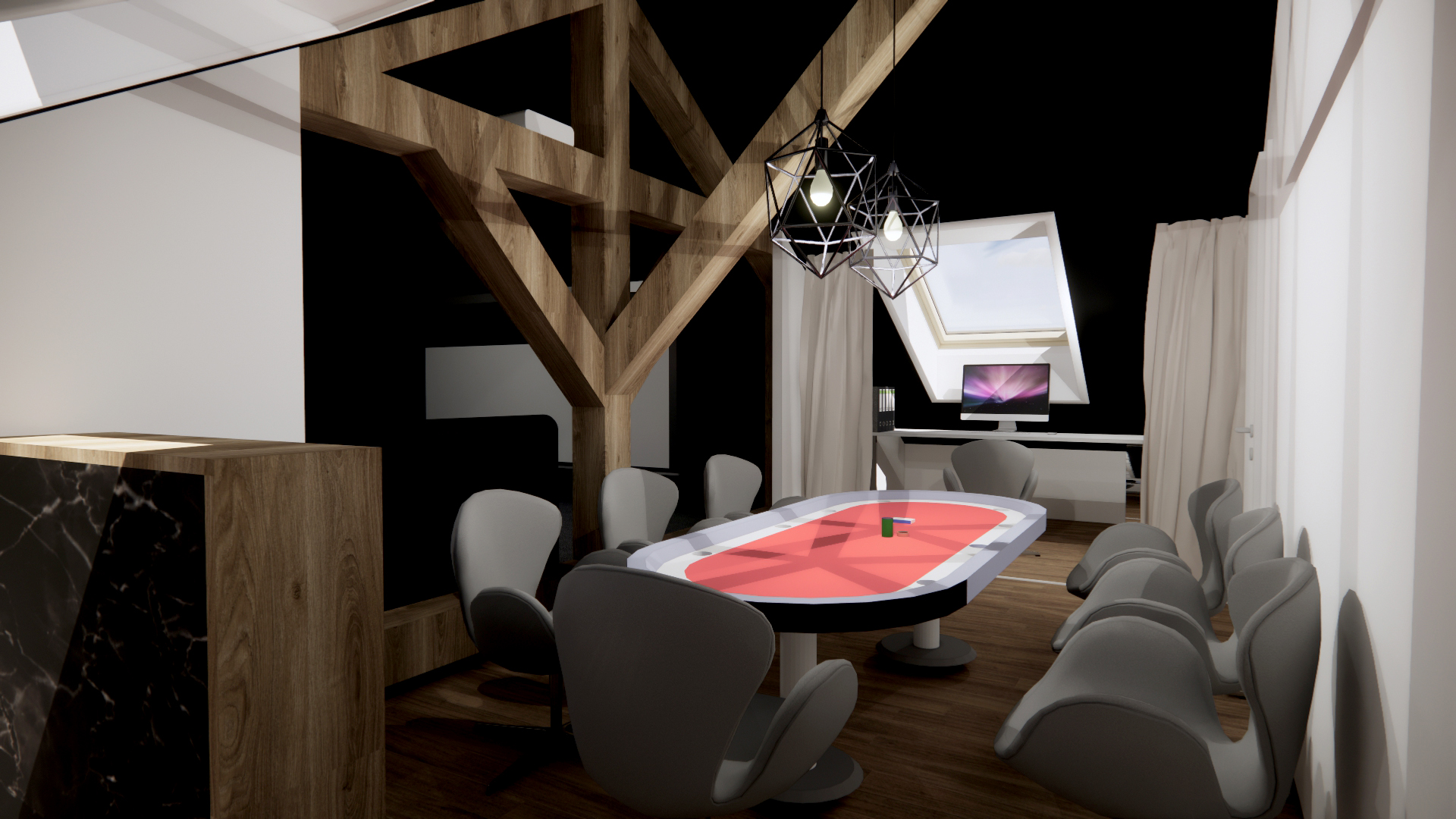 a poker table with card and a green carpet