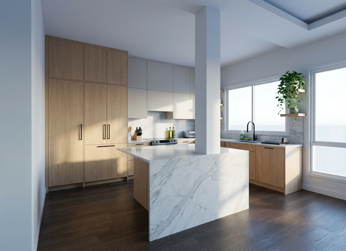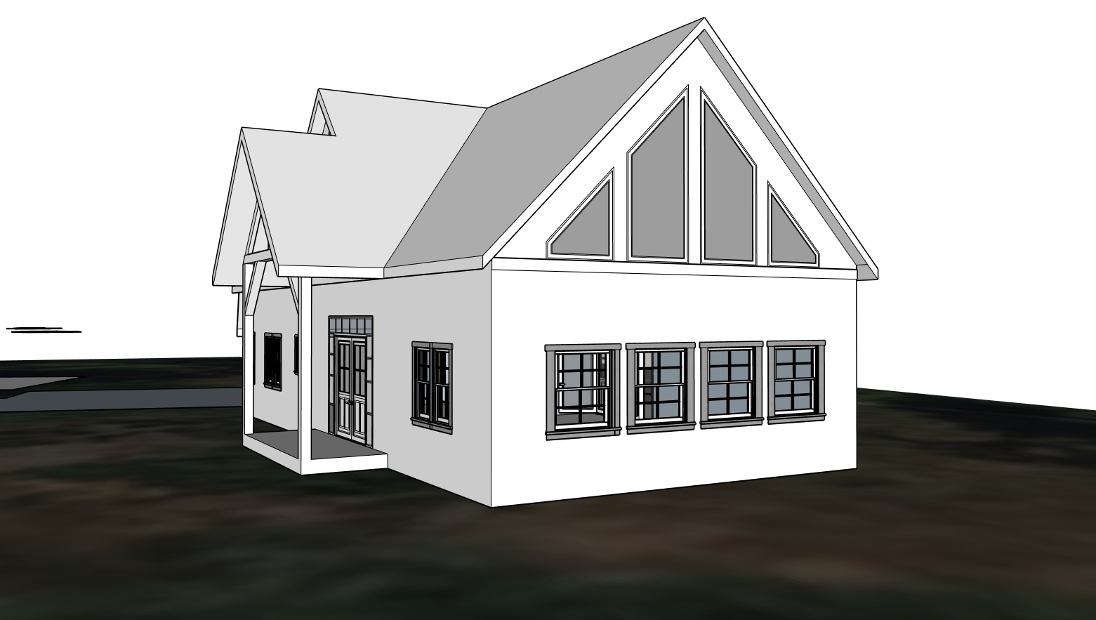 refined modern farmhouse with barn inspired elements asymmetrical front elevation due to side entry garage balanced and intentional design despite offset massing two story home with a connected side entry garage not front facing maintaining strong curb appeal from the front exterior materials include a natural stone base 18 24 high wrapping portions of the home combined with vertical board and batten siding in a warm off white cream tone accents in natural wood or stained timber at porch posts and beams for warmth black framed windows with thicker trim for contrast roofing is architectural shingles in a medium dark tone with selective standing seam metal roofing on porch roofs and lower slope sections front porch is moderately sized not oversized with timber frame detailing and clean lines porch and front door are not perfectly centered but the design compensates with window symmetry and massing balance include subtle architectural elements like a gable feature or dormer to anchor the elevation visually garage is side entry with carriage style doors includes a man door on the side and windows on the front facing wall if visible ensure garage feels integrated not like an afterthought include a dormer or window feature above the garage indicating future usable attic space design should suggest expandability without looking unfinished landscape is a clean upscale rural setting soft lawn defined planting beds with a mix of ornamental grasses shrubs and seasonal flowers add a light gravel or paved driveway leading to the side entry garage avoid over cluttering landscaping keep it intentional and slightly elevated but realistic lighting should be soft natural daylight late afternoon golden hour preferred with realistic shadows and material textures include multiple angles front perspective slight angle showing garage connection and a closer shot of porch detailing overall tone warm inviting high end but practical blending custom home craftsmanship with equestrian barn inspired character avoid ultra modern or overly ornate detailing