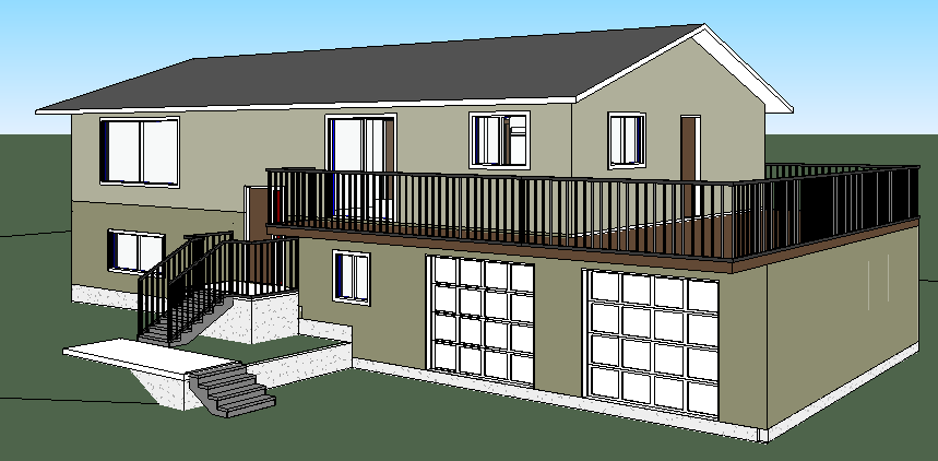 add natural lighting make look realistic add a driveway to the garage doors add minimal landscaping and surrounding trees the bottom floor has a dark green brown stucco and the upper floor is a lighter shade of stucco