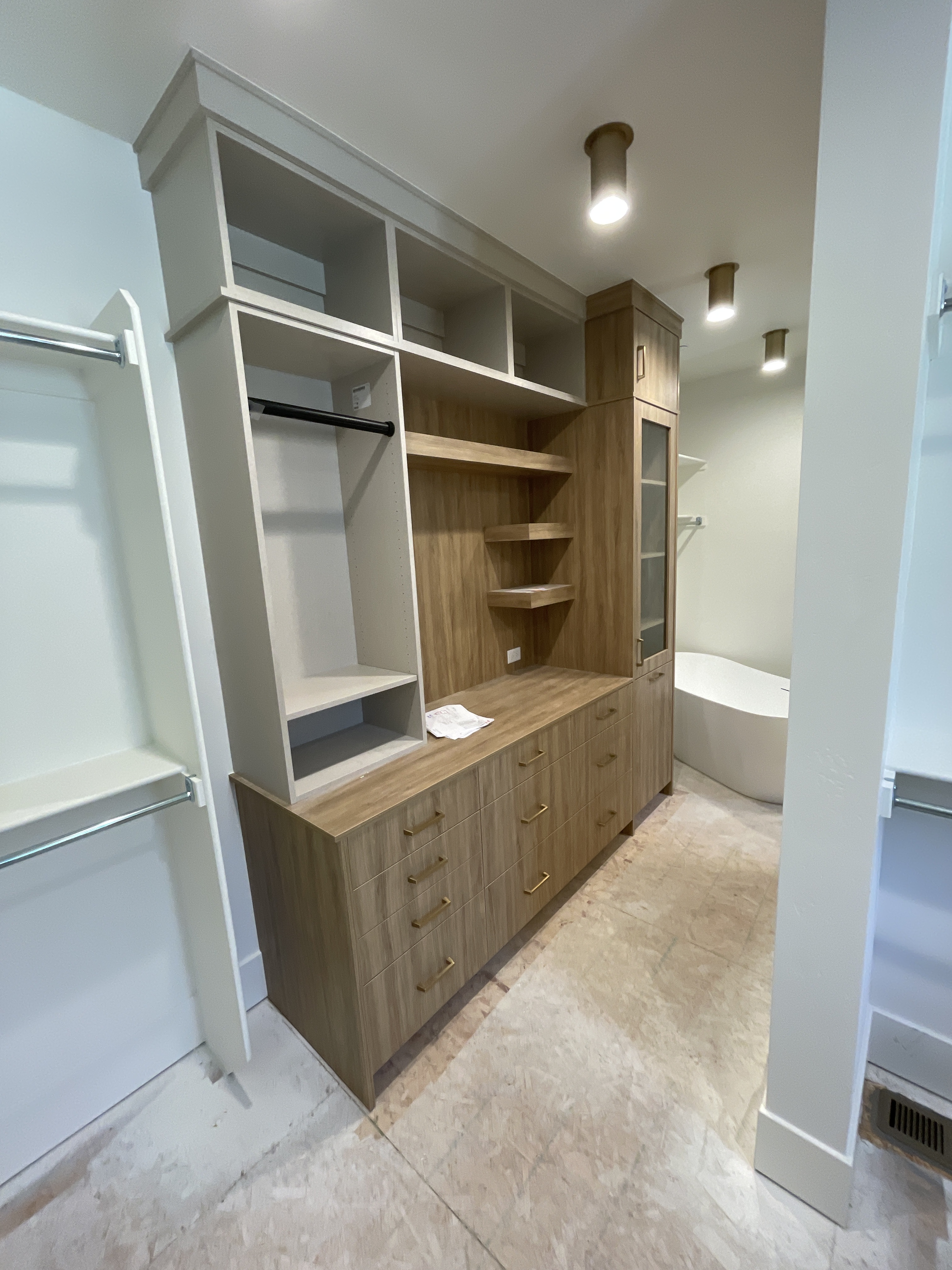 add flooring clean up the rag add clothes handing on the rods style the shelves with purses