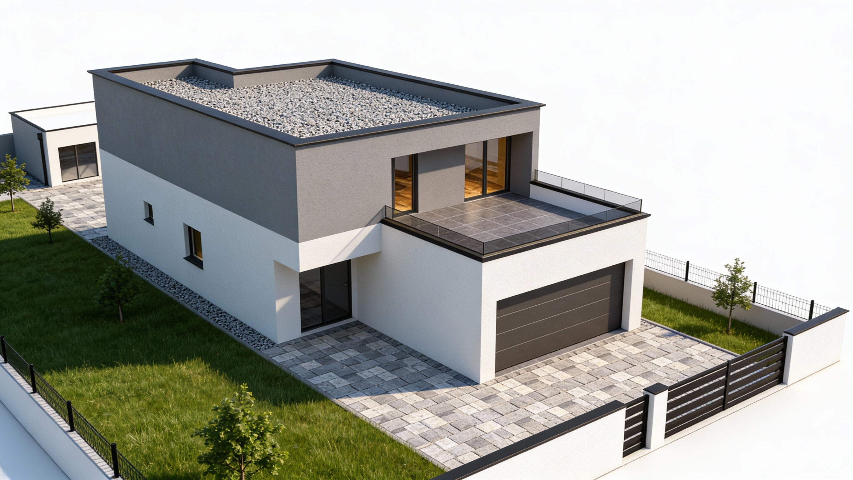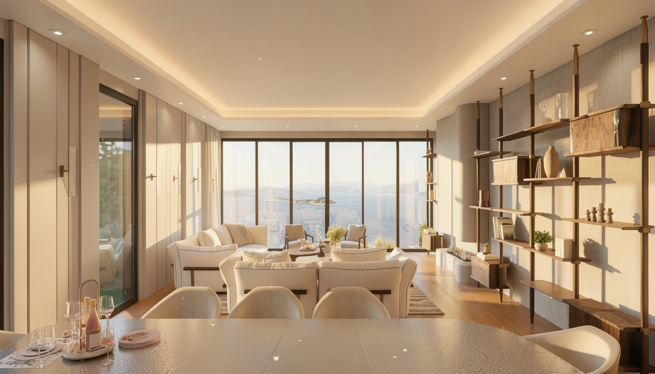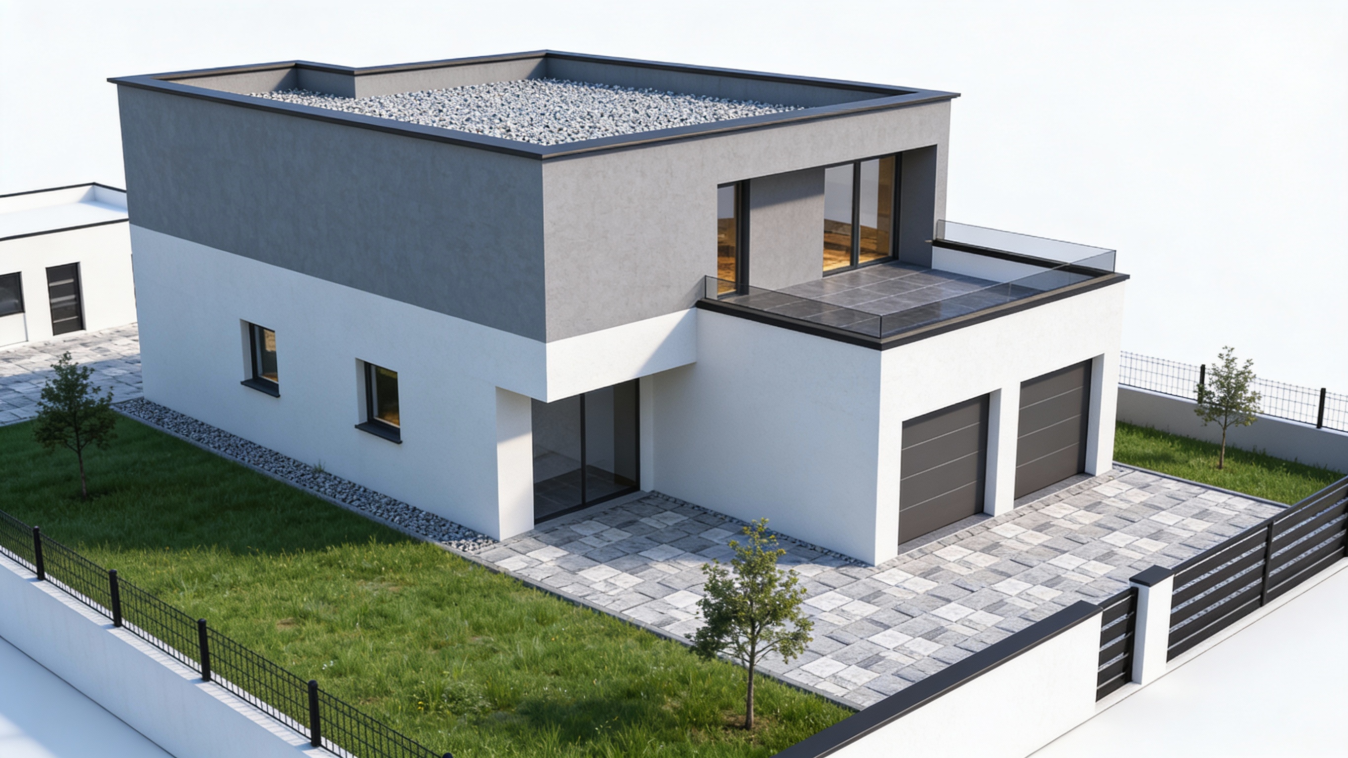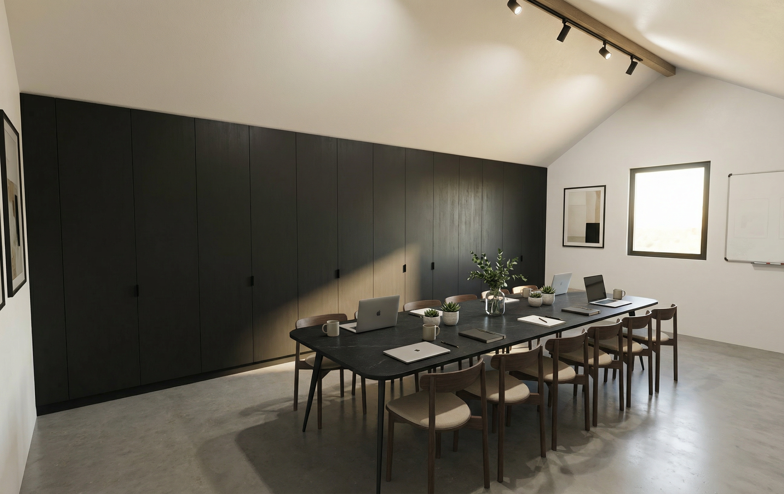 a mid century modern house overlooking the pacific palisades ca ocean with dark wood and black trims steel cable railings black metal fascia on decks black exposed rafters and beams board form concrete base level sloping grass area at base with native landscape and with neighboring houses olive trees native bushes and lush green grass dramatic afternoon setting