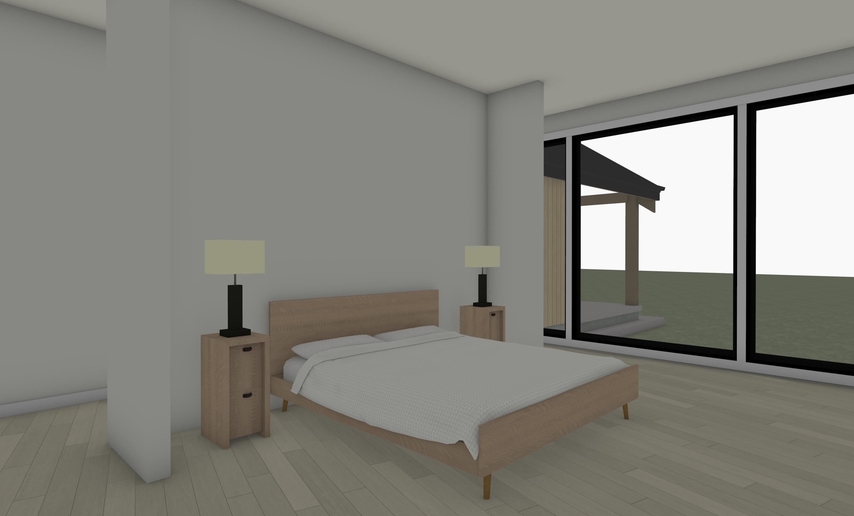 highest priority it s important to keep the sizes of everything the same change textures and materials but keep the sizes of everything the same its important to keep to scale the person in the photo is 5 6 for scale use her for scale and remove her from rendering do not change size of windows or doors do not add doors or windows do not change or add fixtures keep cabinets fridges ovens and all fixtures in the same place and the same size bedroom materials neutral color palette creamy whites warm taupes light wood tones wide plank oak flooring clean and minimal styling high end residential design soft ambient glow architectural visualization ultra realistic 8k detail do accent wall behind bed in same style dark paint with trim design back ground in pine trees and montana vegetation its a hallway behind the bed wall dont add anything just show what i have in the picture