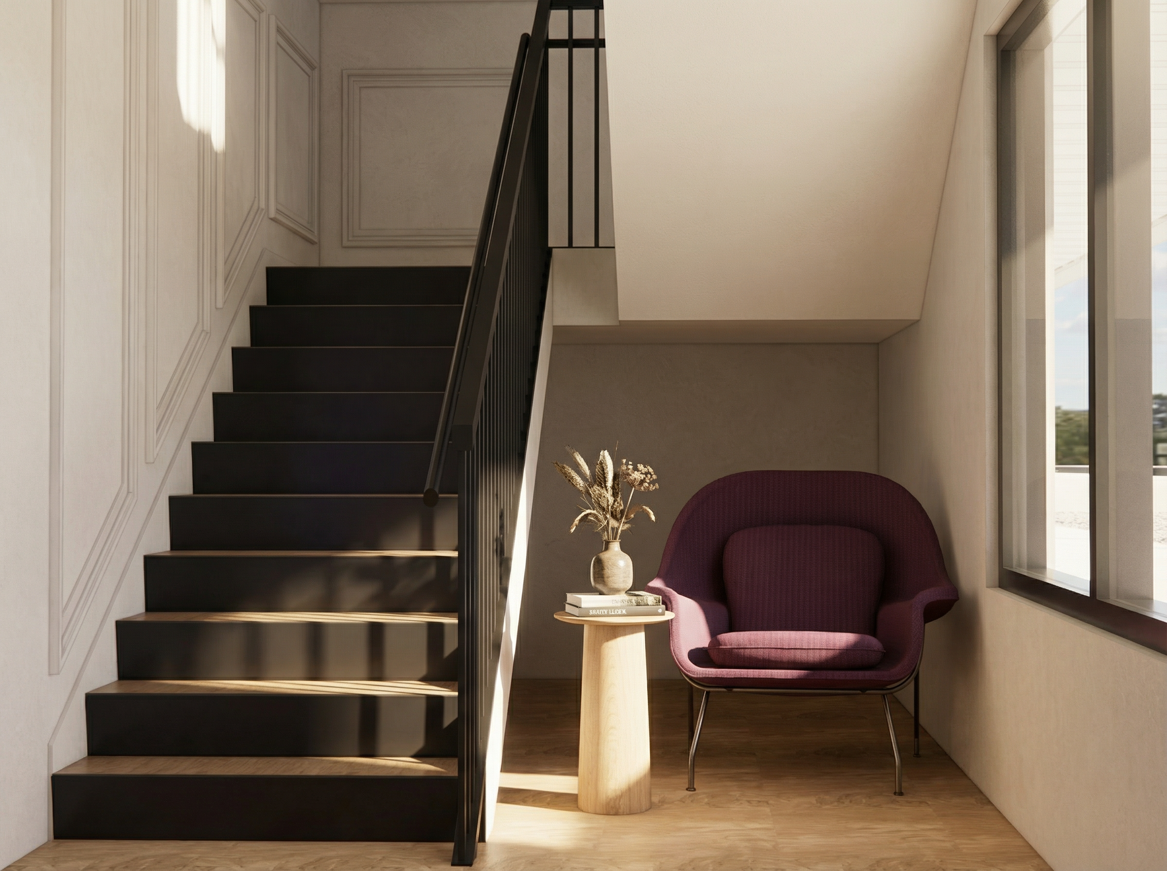 barndominium style with white cladding white painted columns black roofing lawns sunset trees in background