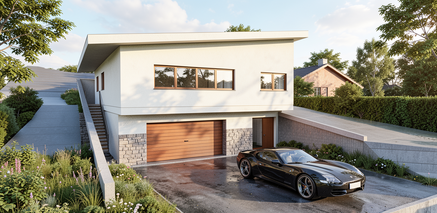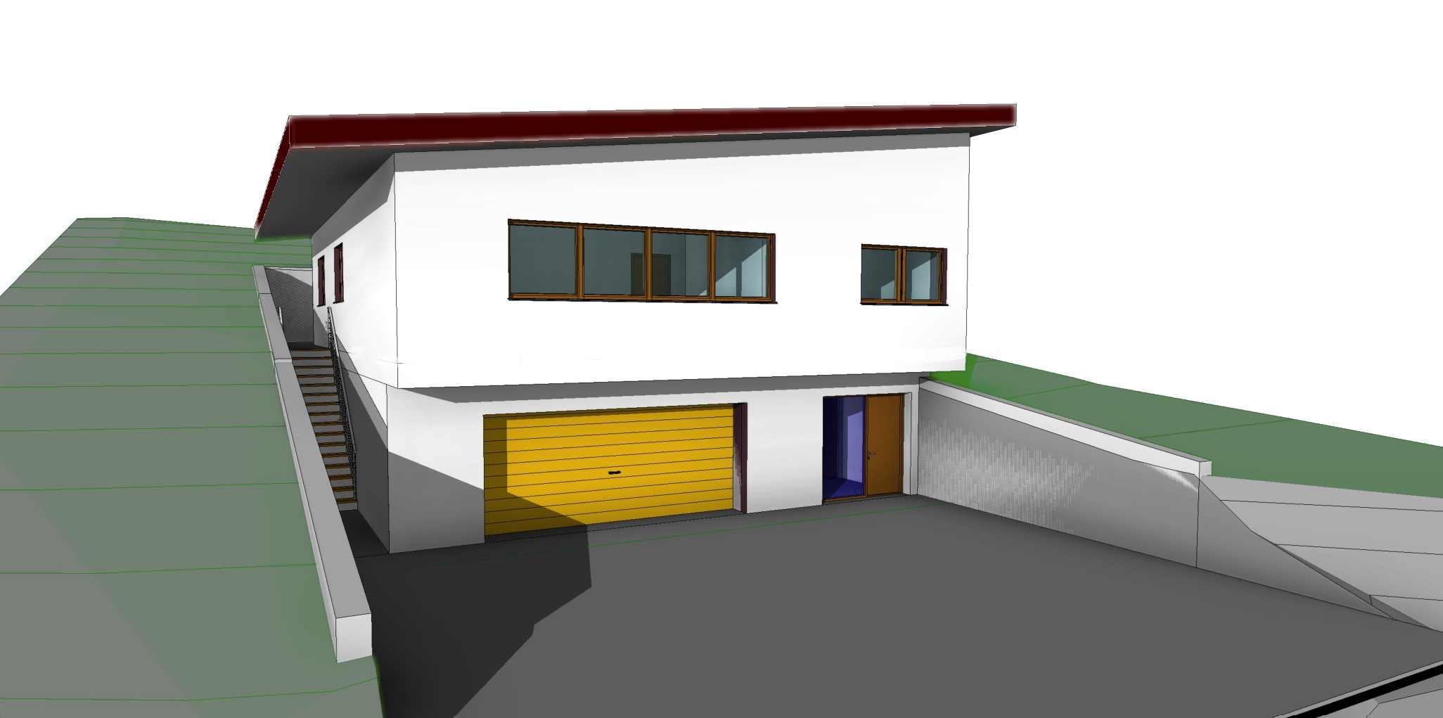 fsafa pri brane hnedy obklad pridaj auto pred garazvou branou okolo domu travnik pred domom medzi opornymi stenami je spevnena plocha s napojenim na cestu strecha tmavohneda nevkladaj do okolia ziadne ine domy je ta m len luka tvar strechy ponechaj tak ako je na originale