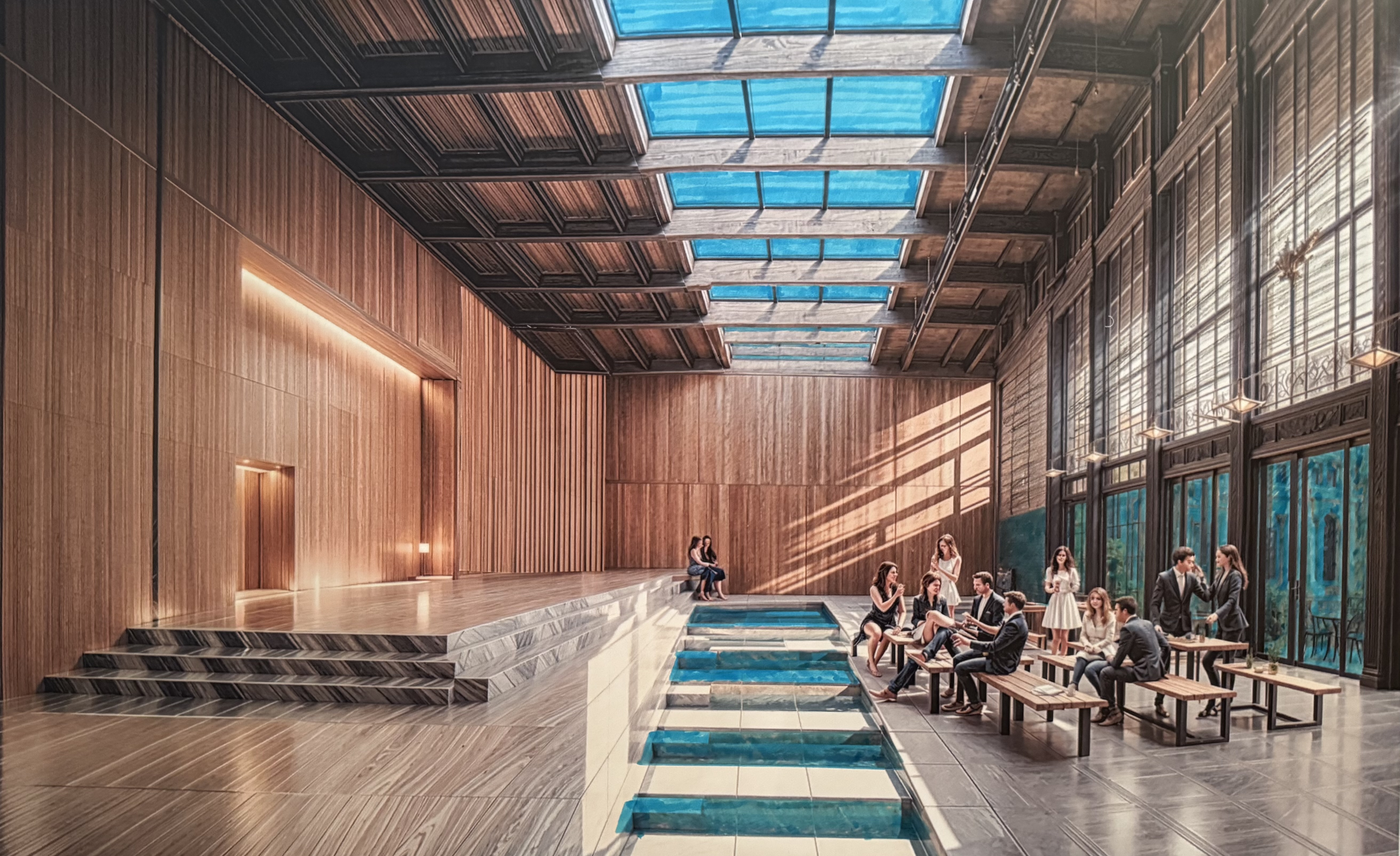 interior shot keep the layout perspective and style of the original image replace the blue roof and floor elements with transparent glass windows the ceiling and floor glass panels should be aligned and parallel to each other make the floor material consistent throughout smooth light gray modern concrete or stone replace the wall lamps on the right with more modern minimal linear lighting lower the overall height of the room slightly also make the entire right wall out of glass replace the stone or brick section in the back right corner with full height glass panels to match the rest of the glass wall architecture