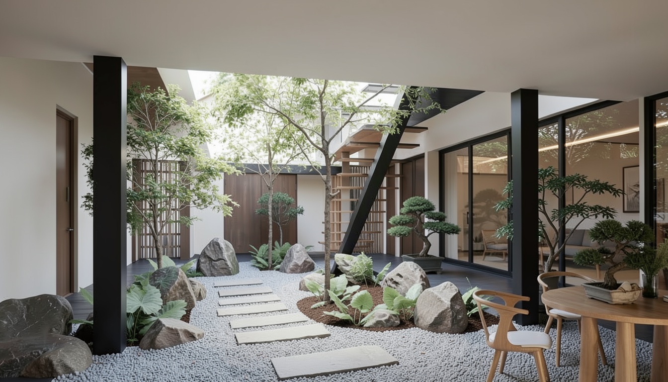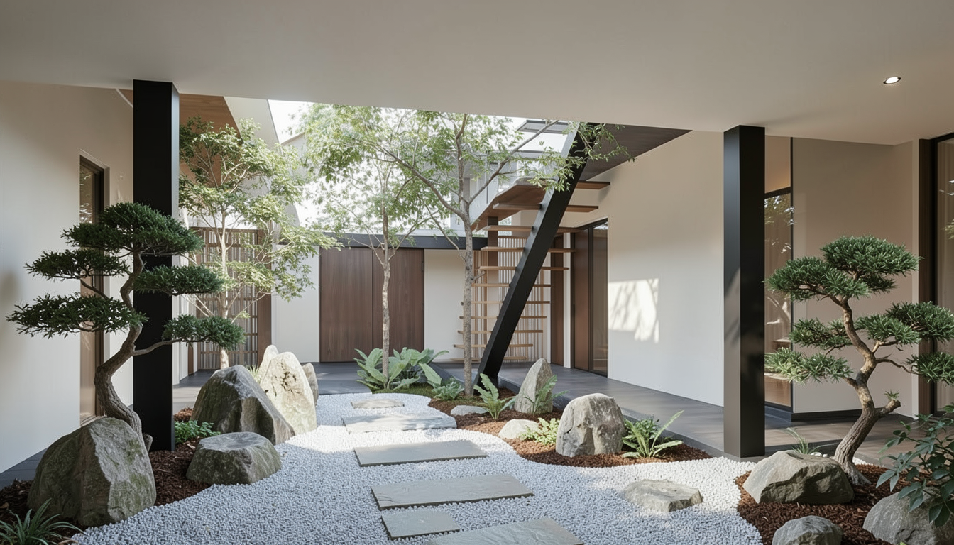 same scene same architecture same materials and lighting no changes outside the garden area only redesign the courtyard garden add a minimalist zen landscape with large decorative boulders sculpted small trees low plants and small discreet stepping stones embedded naturally maintaining a clean and elegant composition no modification to walls floors furniture or staircase photorealistic architectural render high detail 8k