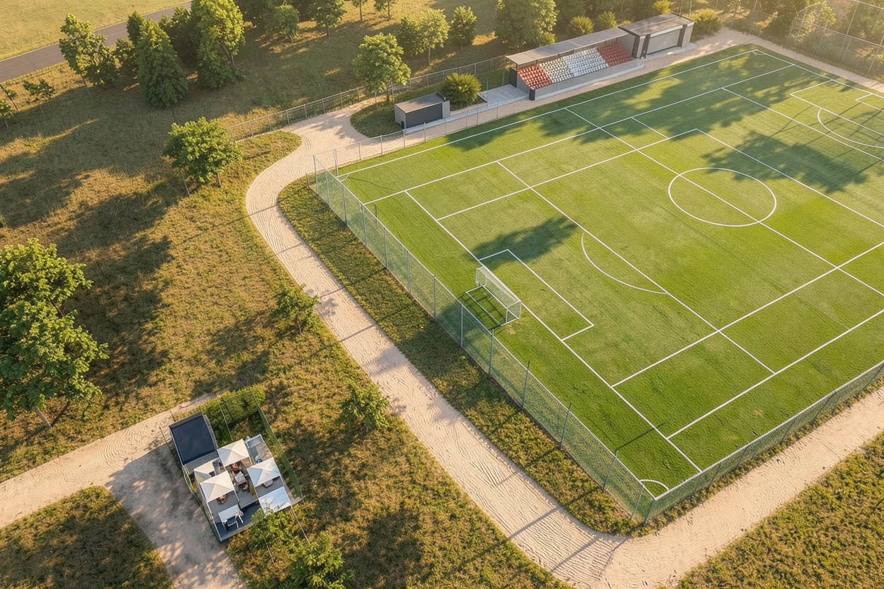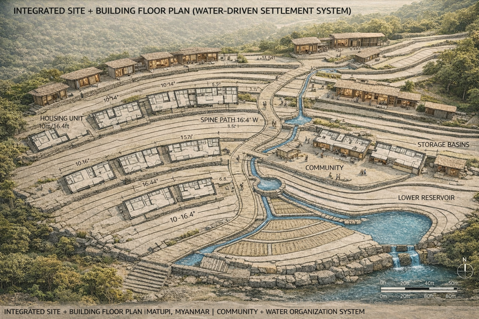 architectural floor plan drawing of a terraced hillside settlement in matupi myanmar maintain the exact site layout building positions terraces water channels and circulation spine as shown in the reference image do not change the site organization convert all buildings into detailed 2d architectural floor plans top down orthographic view showing interior room layouts walls openings and structure doors and windows consistent unit modules include dimension lines inches and feet structural grid where appropriate labels for housing units community buildings and health center water channels and circulation paths clearly drawn style clean architectural line drawing black gray linework minimal shading consistent line weights thicker for walls lighter for site soft earth tone background with blue water keep terrain contour lines and terraces visible but lighter than buildings ensure accuracy clarity and consistency across all buildings and site systems