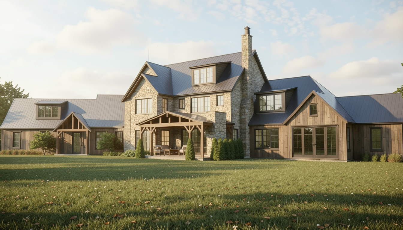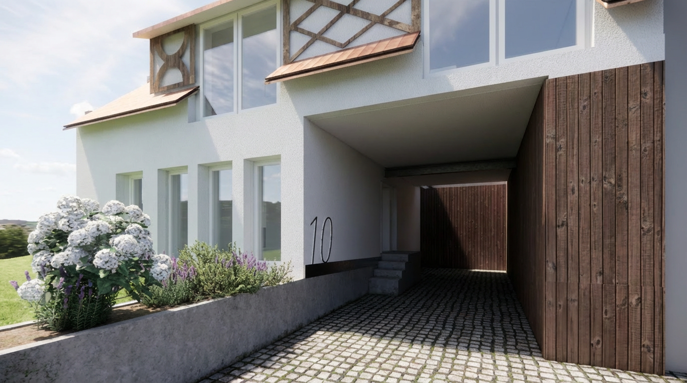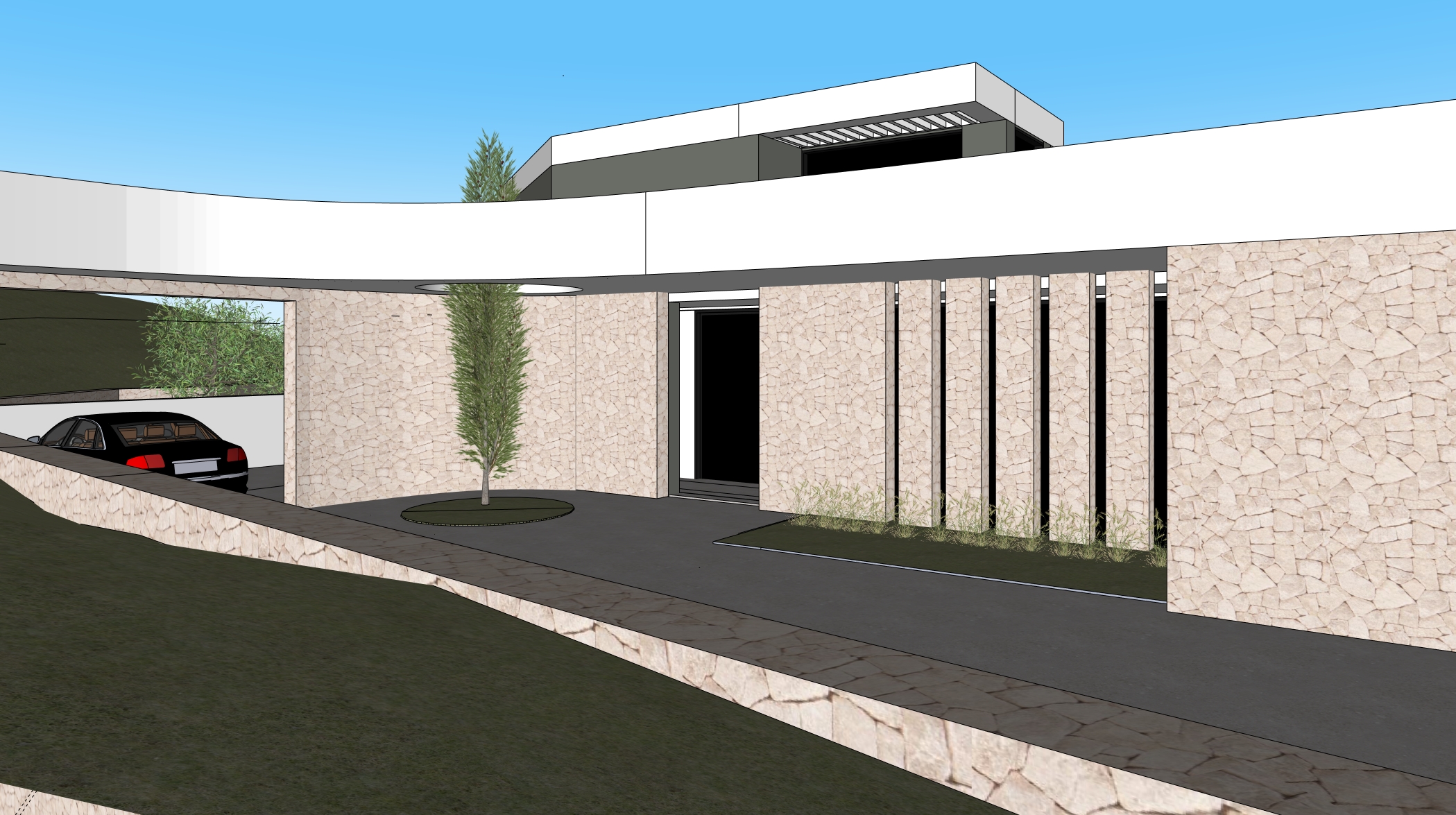 modern luxury hillside villa in tolo greece viewed from a lower eye level angle showing the entrance architecture contemporary minimalist villa with curved and cantilevered slabs grey wall plaster as exist in the model stone wall more realistic texture at the end concrete floor landscape natural green lawn dominates the site no gravel no rocks no dry landscape lighting atmosphere golden hour sunset warm luxurious lighting cinematic sky soft shadows high end luxury villa atmosphere elegant and calm materials exposed grey plaster wall white plaster natural stone only on the building large glass panels style photorealistic ultra detailed architectural visualization real estate quality render global illumination