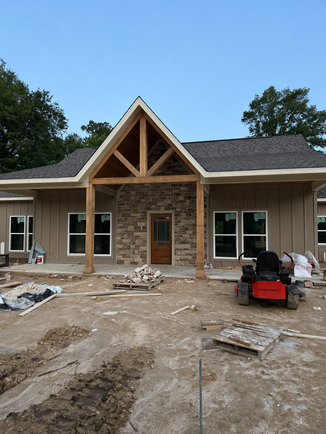 make the siding and eaves white have the posts stained to match the wood porch ceiling do not change the lighting or modify the color of the stone