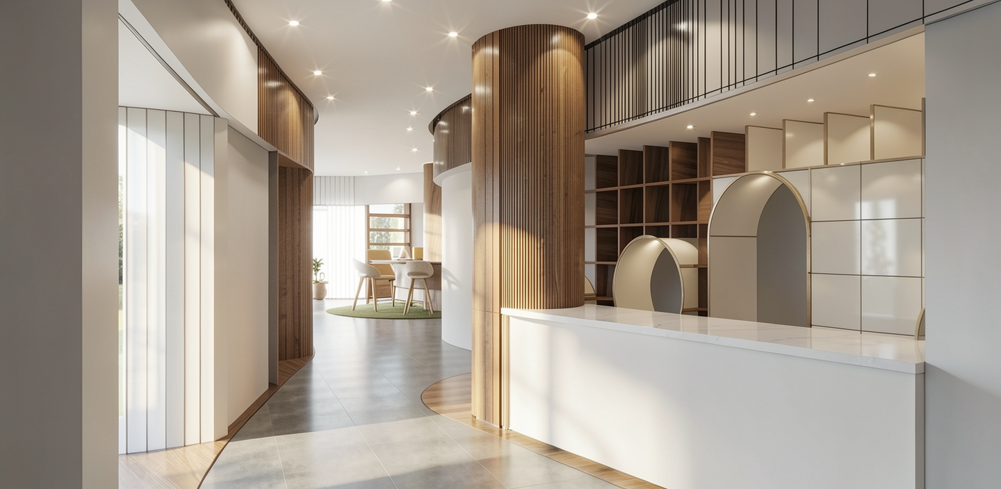 contemporary elegant hotel lobby interior quiet luxury minimalist design with refined details grand belle poque proportions reinterpreted in a contemporary language high arched ceilings and rhythmic structural bays inspired by early 20th century romanian architecture 1914 1915 clean lines calm symmetry and balanced composition materials light marble floors with subtle veining warm limestone and plaster walls brushed brass accents refined metalwork inspired by interbelic era ornamental motifs graphic accents used sparingly custom reception desk in marble with precise detailing architectural references to the casino of constan a monumental arches elegance without excess fluid spatial transitions and ceremonial symmetry contemporary interpretation of belle poque and romanian interwar period aesthetics through materiality proportion and rhythm rather than ornament contemporary elegant hotel lobby interior expressing quiet luxury and refined minimalism grand belle poque proportions reinterpreted in a contemporary language inspired by a historic hotel built in 1914 1915 in constan a romania monumental arches rhythmic structural bays and strong axial symmetry reference the casino of constan a and romanian interwar architecture expressed through proportion scale and materiality rather than ornament light marble floors with subtle veining warm limestone and plaster walls sculptural marble reception desk with precise detailing brushed brass accents and minimalist metalwork inspired by interbelic motifs clean lines graphic restraint balanced composition and timeless elegance contemporary elegant hotel lobby interior design that preserves the original belle poque architecture of a historic hotel built in 1914 1915 in constan a romania no new architectural elements added no new walls doors columns or openings the existing arches stair proportions and spatial rhythm remain intact and clearly legible quiet luxury and minimalist intervention expressed through material refinement surface treatment lighting and furniture only architectural references to the casino of constan a and romanian interwar period through scale symmetry and material discipline rather than ornament materials light neutral marble floors with restrained veining cool limestone or off white mineral plaster walls sculptural marble reception desk brushed brass and dark metal accents inspired by interbelic graphic motifs cool restrained palette of soft whites light greys stone tones muted blues and charcoal accents no dominant beige hues contemporary elegant hotel reception interior preserve exactly the existing architectural form proportions layout and functions of the base image do not modify walls openings ceiling geometry or stair position apply a refined material palette inspired by the monumental stair honed natural stone flooring warm wood wall paneling dark patinated metal details and tactile textiles with subtle romanian inspired geometric patterns discreet luxury clean lines minimalist composition with graphic accents curved and enveloping furniture custom banquettes sculptural reception desk in wood and stone layered architectural lighting soft ambient glow concealed linear lighting warm accent pendants emphasizing texture and rhythm rather than ornament earthy muted color palette warm browns stone beige deep umber soft brass calm intimate atmosphere contemporary expression rooted in historic proportions photorealistic render high material realism soft shadows warm tone refined and timeless mood