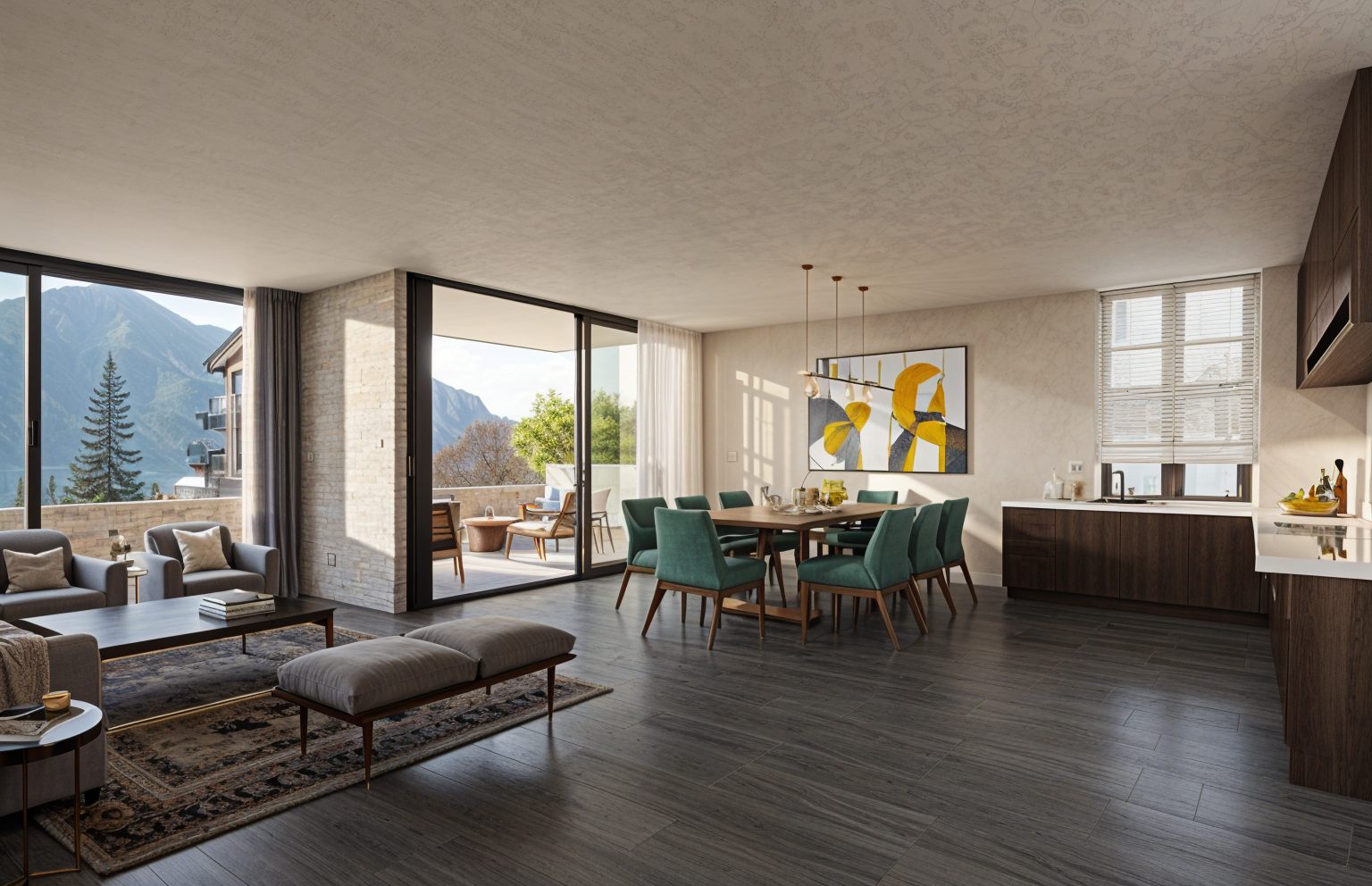 generate a photorealistic architectural perspective from the provided 2d elevation respecting all geometric offsets material specifications and environmental conditions listed below prioritize dimensional accuracy material fidelity correct depth hierarchy and realistic rural lighting 1 massing depth constraints critical geometry reconstruct the building volumes with strict respect to recession distances garage volume right side in green primary reference plane at 0 0 most forward mass of the building middle volume with three windows in yellow recessed 26 0 from the 0 0 garage plane maintain planar alignment across all three windows left volume with patio door window in grey recessed 31 0 from the 0 0 garage plane slightly deeper than the 3 window volume far left covered terrace concrete slab aligned with the left volume covered by the main roof supported by 8 x8 cedar posts exact section size must be visible ensure all volumes are reconstructed with correct parallax vanishing points and shadow projection based on their recession distances 2 exterior materials exact specifications siding maibec board batten snow white finish vertical battens must be visible with correct spacing and shadow depth slight matte texture not glossy roof steel roofing color steel grey subtle metallic reflectance standing seams visible soffits fascia white smooth finish low reflectivity window trims exterior doors white consistent with soffits fascia clean edges no discoloration foundation exposed concrete natural grey tone slight roughness realistic micro texture wood columns cedar warm orange brown tone visible grain natural variation satin finish 3 environmental context location rural countryside typical of outaouais laurentides mixed forest vegetation conifers deciduous trees slight terrain irregularity natural soil grass and shrubs lighting early morning sunrise from the east soft warm reflection on the fa ade long low angle shadows no dramatic hdr effects realism only atmosphere crisp rural air slight morning haze acceptable neutral sky with subtle warm tint 4 rendering requirements perspective true to scale reconstruction from the 2d elevation correct vanishing points and depth compression no fisheye distortion material realism physically accurate pbr style textures subtle micro shadows between battens steel roof must show controlled specular highlights color calibration whites must remain neutral no blue or yellow shift cedar must remain warm and natural concrete must remain cold grey overall style high fidelity photorealism clean sharp architectural grade rendering no stylization no artistic exaggeration 5 output expectations a single perspective view showing only the full fa ade accurate reconstruction of all recessions and massing realistic lighting consistent with sunrise faithful reproduction of all materials listed above rural outaouais laurentides context integrated naturally