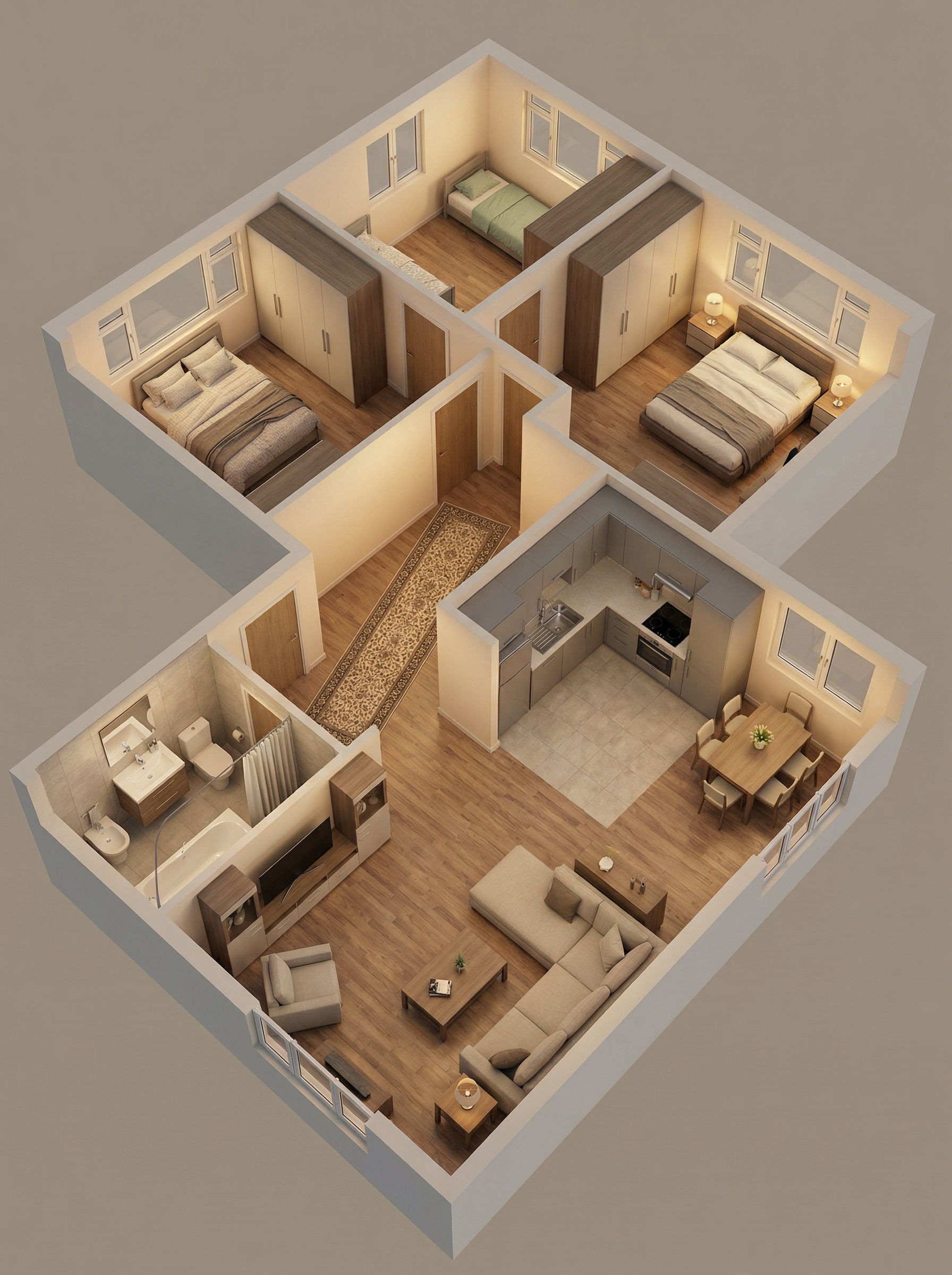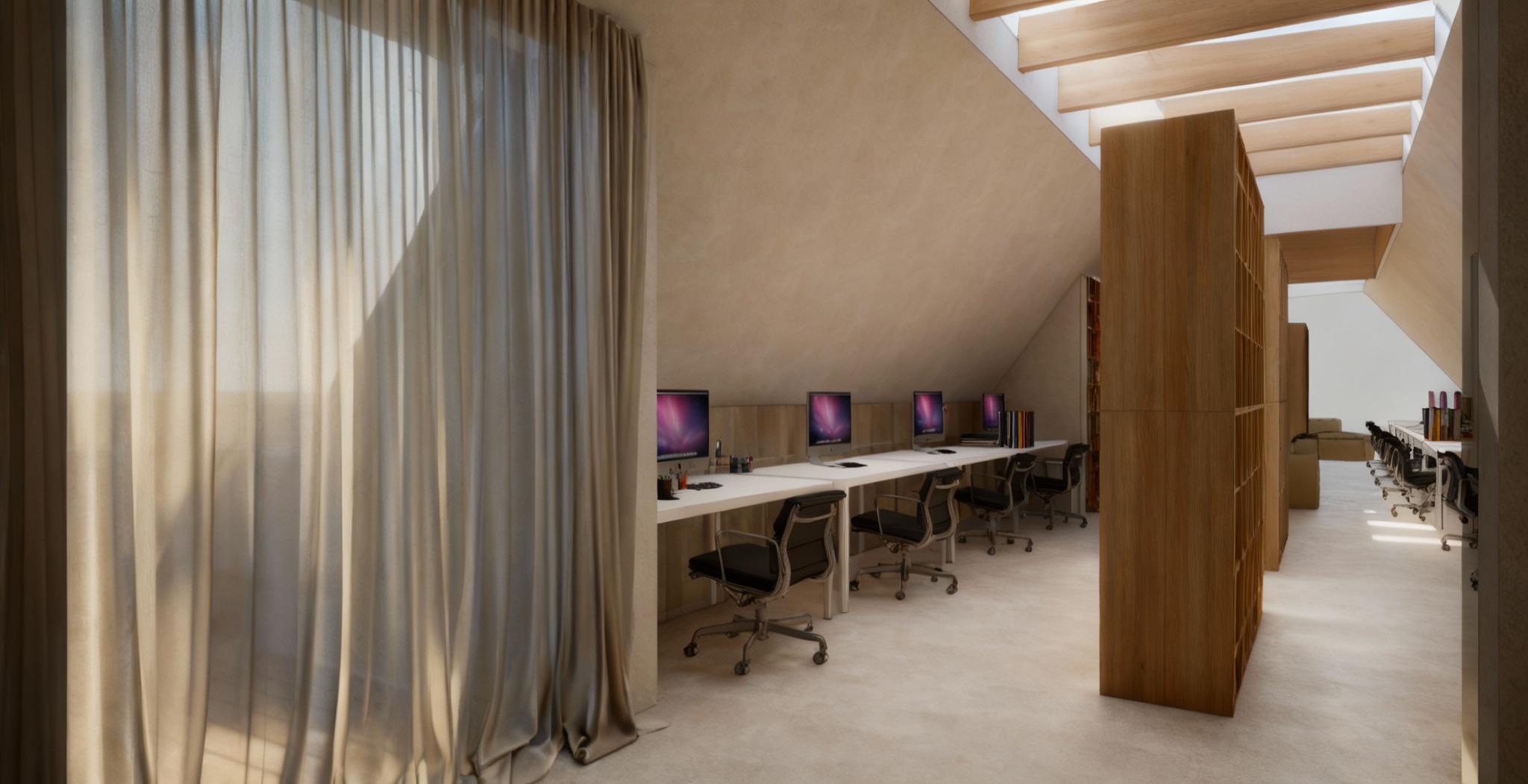 office space in the attic soft light add office supplies to the table add books to the shelves wooden parts bleached oak curtains white
