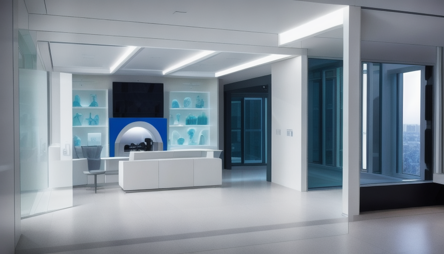 interior living room modern and minimalist design warm wood ceiling beams light neutral walls large tv on wall above a contemporary fireplace shelves with plants and vases gray sofa with textured cushions sleek black side table with potted plants blue gray cabinets in the background large windows with natural light calm and cozy atmosphere soft ambient lighting day setting