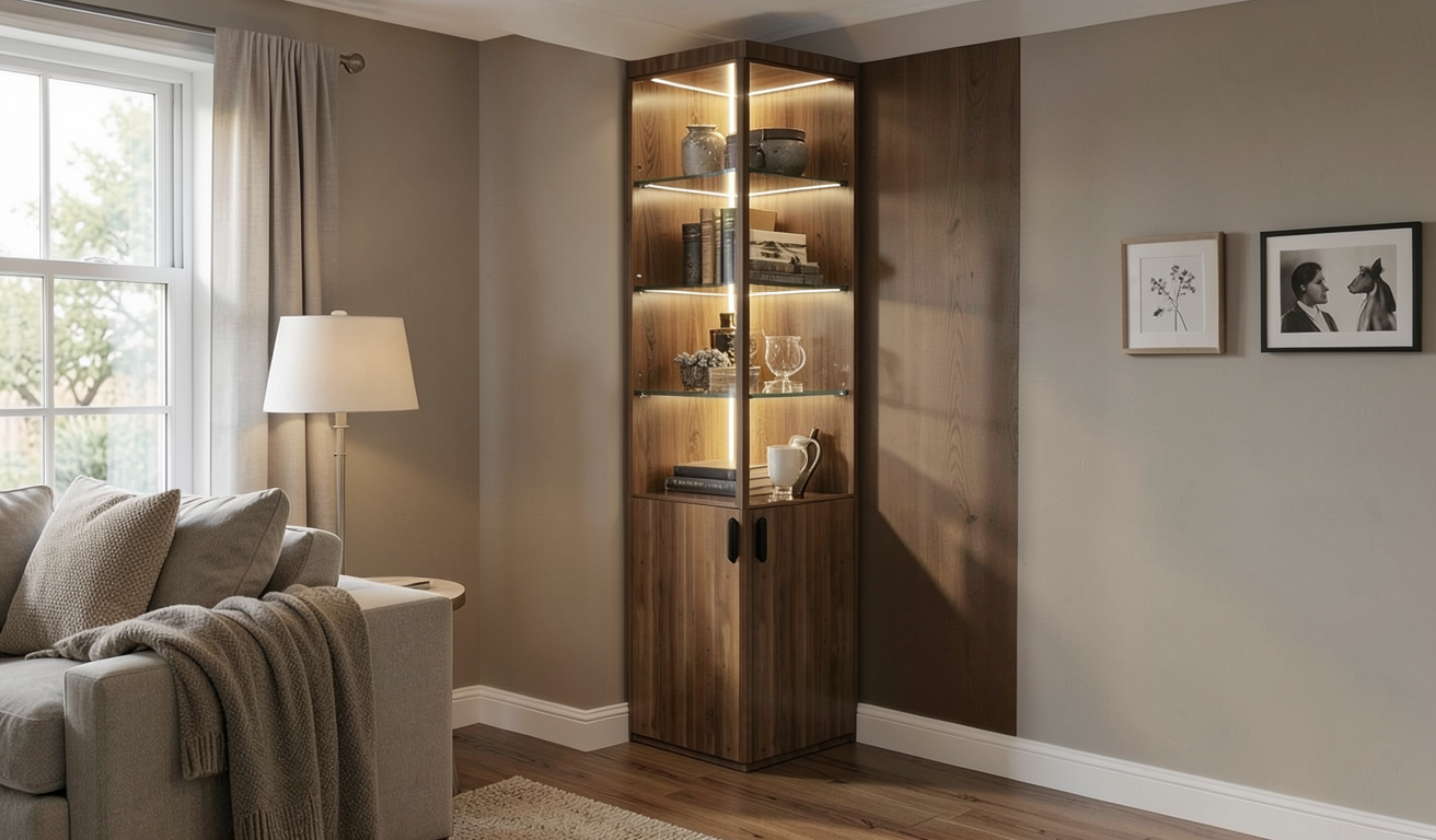 render this corner cabinet add led strip inside the shelfing inside is glass with a half glass half walnut wood finish add accessories inside place it in a room still corner make the walnut finish less harsh and the led light less harsh