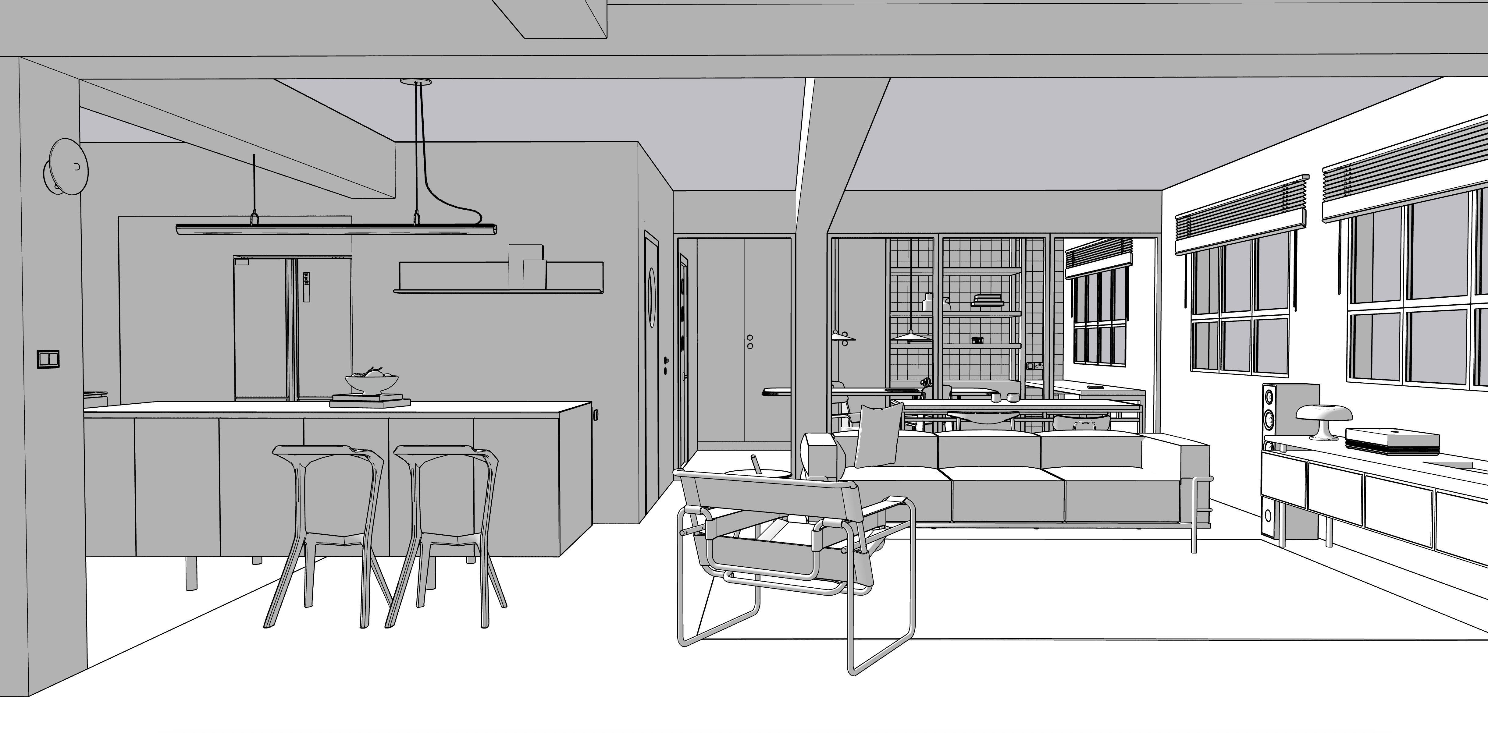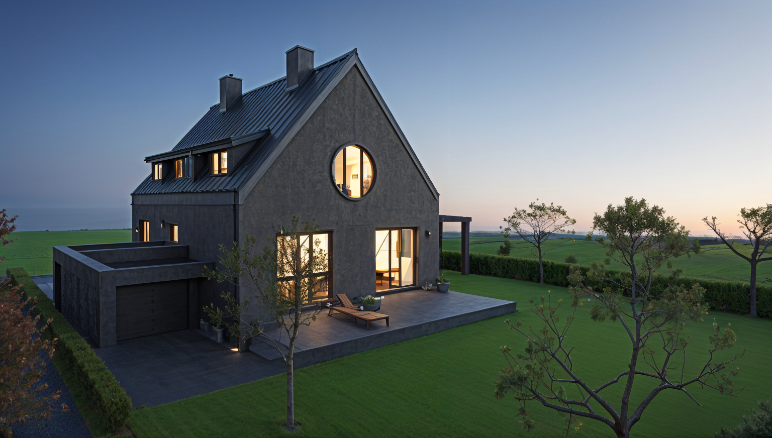 exterior shot concrete textured beams natrual daylight stainless steel island