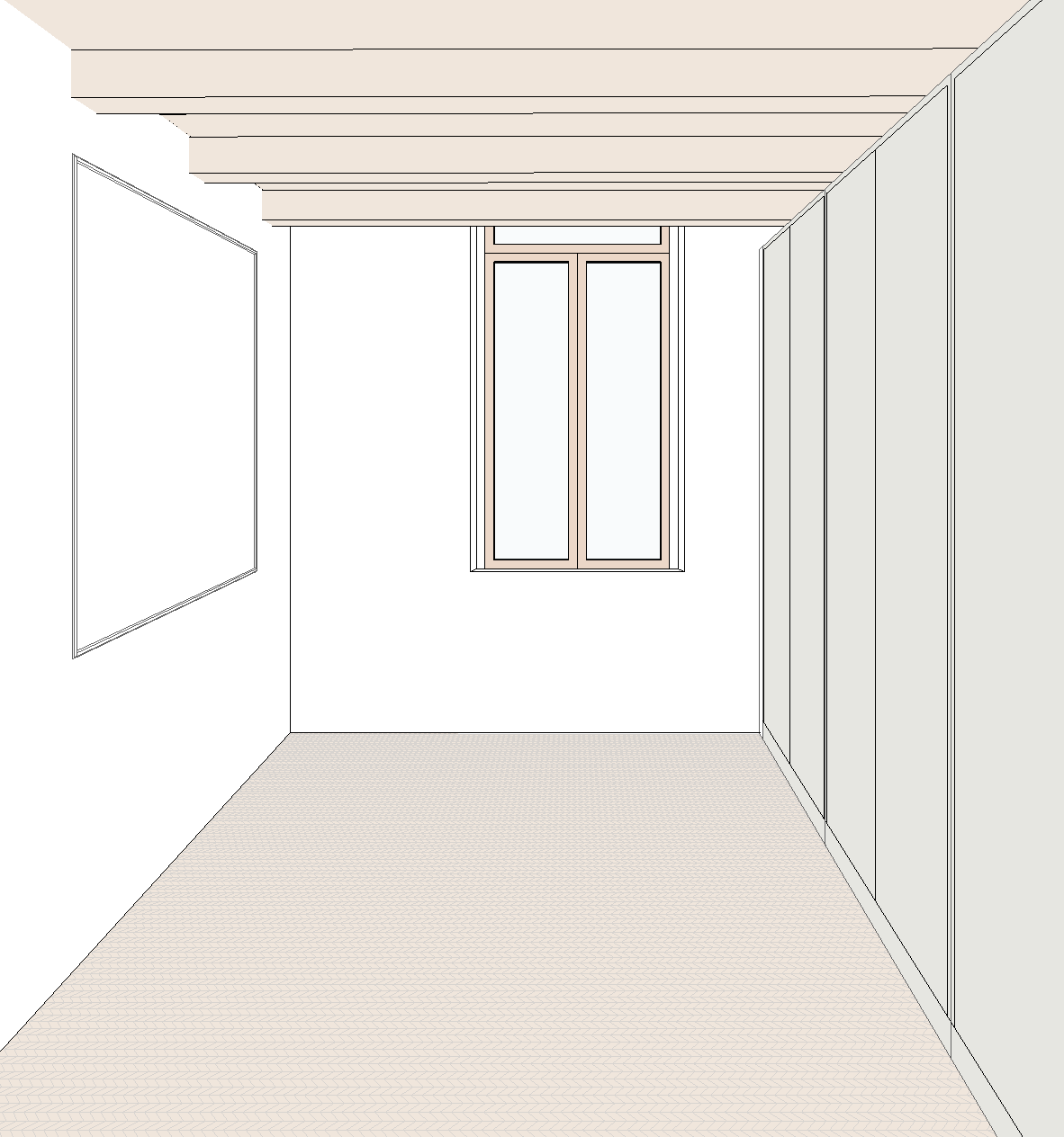 crea un render fotorealistico a partire da questa vista e una camera da letto sulla destra ci sono armadiature moderne a tutta altezza sulla sinistra c un letto comodo con testiera alta e due comodini moderni sopra ai comodini pendono due lampade moderne il soffitto in travi in legno a vista il pavimento un parquet a spina ungherese