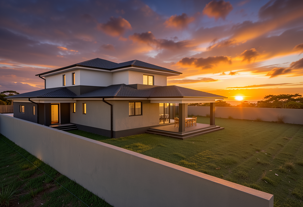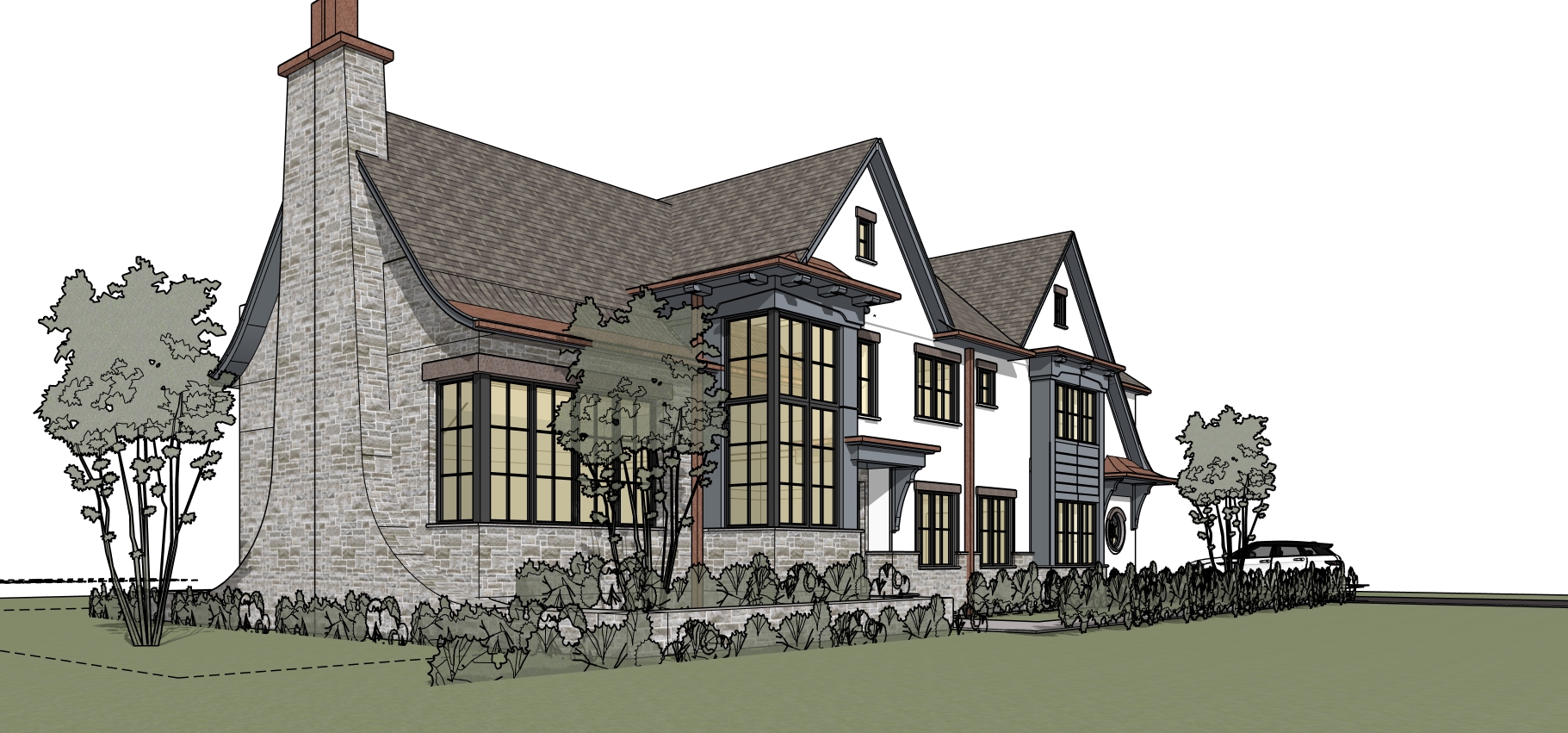 charming industrial stone and stucco farmhouse with large grid windows set with grass lawn trees in background light distant fog maintain model geometry and materials white stucco new gray england stone base