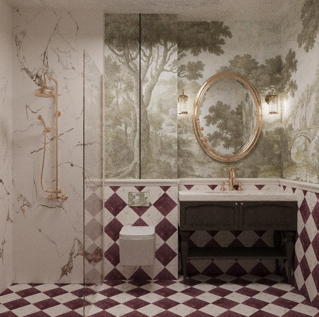 maintaint color and geometry the green wall keep it like that do not intesify the green wall keep it exactly as it is only put better quality marble in the shower and good quality objects