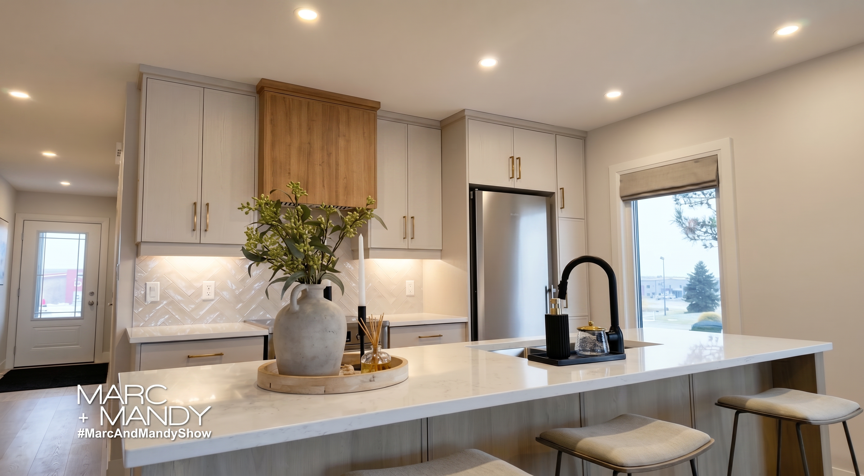 modern architecture light greige structurated rough concrete plaster facade evening matte coated titanium zinc roof in light greige natural oak main doors matte coated steel fence in light greige light grey beige aluminium windows photorealistic architectural visualization facade and ornamental grasses at the entrance illuminated by ground mounted spotlights greige garrage doors