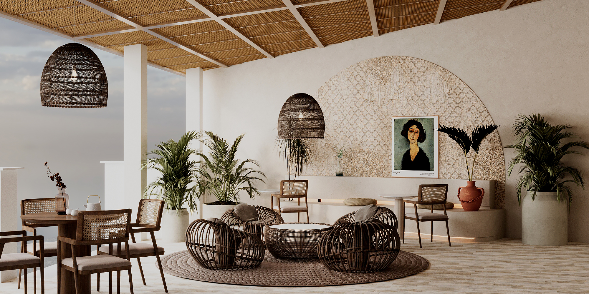 bohemian concept open air restaurant with ethnic patterns regional rug on the floor no ceiling fewer plants