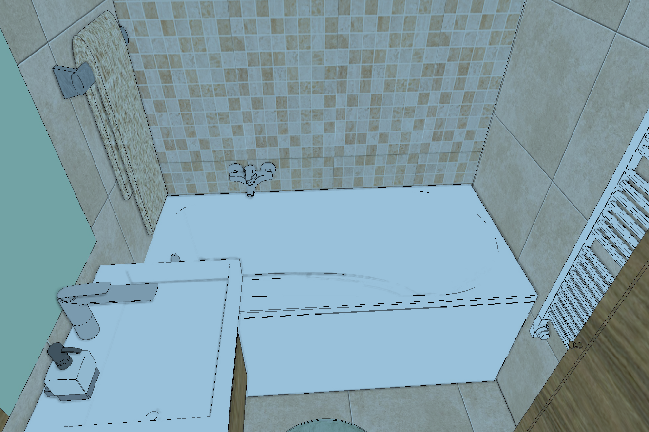 mirror on the wall above the sink pale beige marble tiles on the wall and on the floor pale beige marble on the side of bathtub too middlebrown wood furniture white sink bathtub and radiator