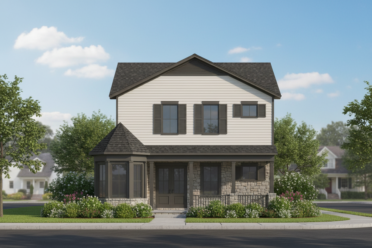 only detail the building in the center to be black brick add street context and trees