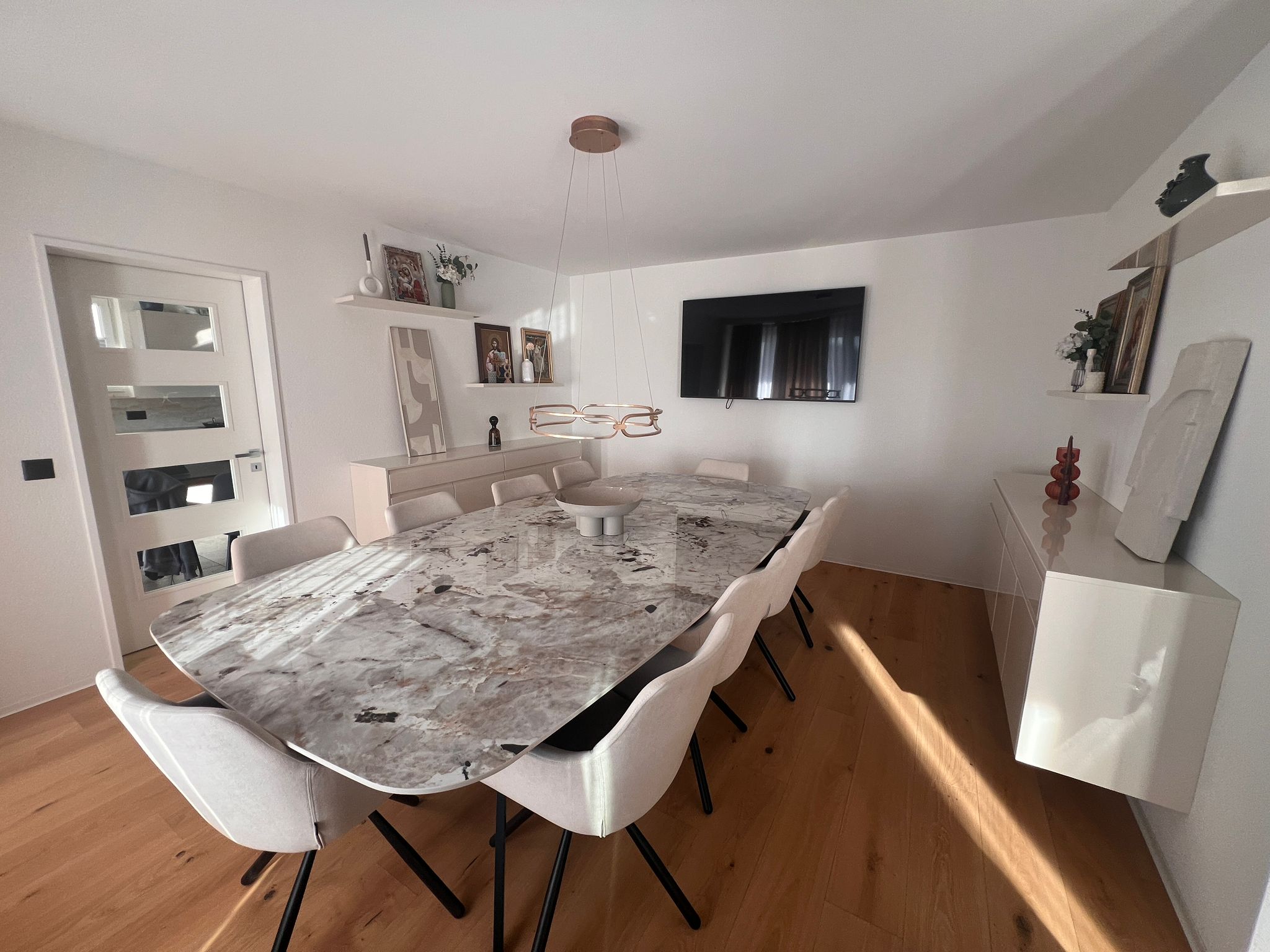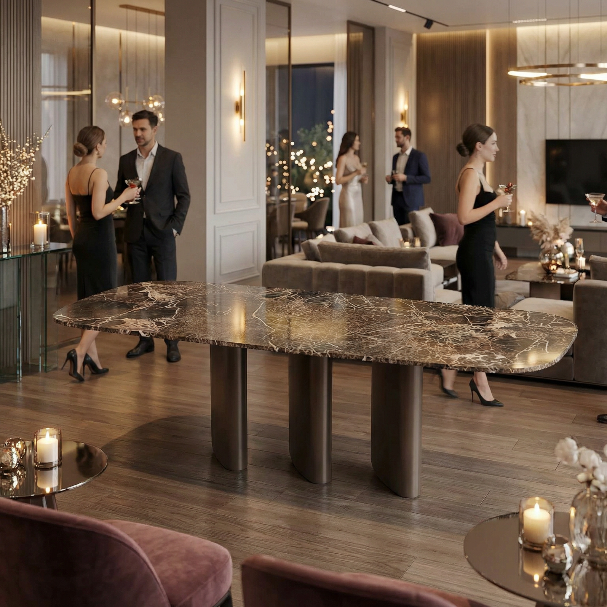 interior shot create a cinematic walkthrough inside a luxurious modern home during an elegant cocktail party the environment features warm ambient lighting refined architectural details and sophisticated d cor the main focus of the video is a sleek ultra modern designer table placed centrally in the living area guests move naturally in the background holding drinks chatting softly and creating a lively yet upscale atmosphere camera movements should gently orbit glide and highlight the table s craftsmanship materials and textures bokeh lighting reflections and soft shadows enhance the premium feel the overall mood is refined vibrant and social an exclusive evening event showcasing the table as the centerpiece architecture