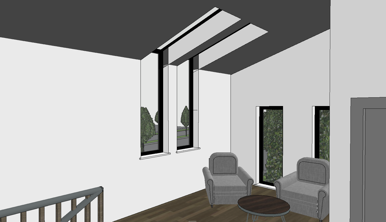 modernist interior shot a modern cozy living room with a minimalist design the walls are painted a soft pastel white the ceiling is a sophisticated matte charcoal gray two plush armchairs upholstered in a light gray fabric sit invitingly in the corner a small sleek coffee table with a polished dark wood finish completes the seating area the wooden floor has a rich walnut tone adding warmth to the room the large windows let in natural light and offer a view of green foliage outside enhancing the serene atmosphere soft ambient lighting creates a warm and inviting atmosphere architecture
