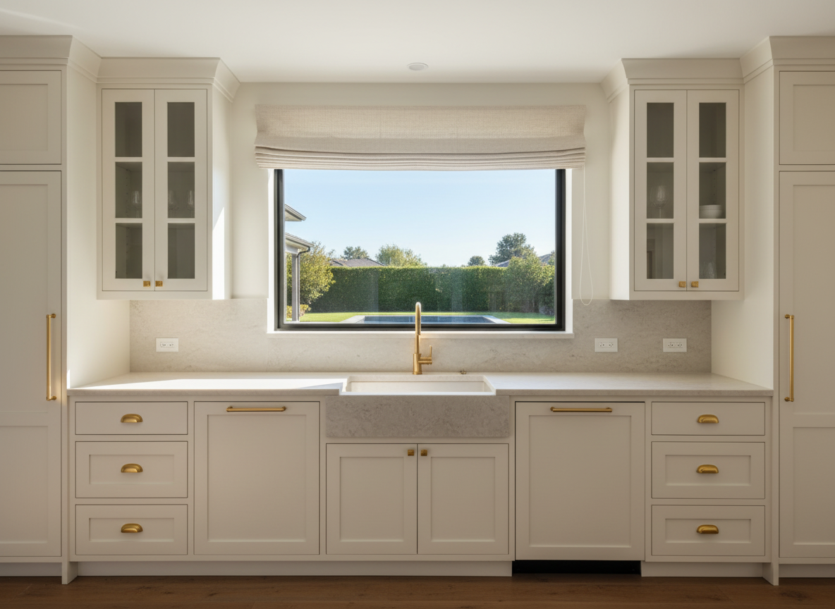 keep the exact same layout geometry proportions and camera angle do not change any colors materials shapes or add any new objects inside the room enhance realism only improve material textures with subtle imperfections refine shadows and add natural global illumination increase detail and depth while preserving the original design lighting adjustment make the room brighter as if illuminated by a central ceiling light source simulate soft diffused overhead lighting without adding or showing any light fixture do not introduce any visible lamps pendants or light objectsexterior view replace the window background with a realistic backyard garden scene ensure the exterior lighting matches the interior lighting direction and intensity keep the view soft slightly out of focus and not distracting do not change the window shape size or position keep lighting natural evenly distributed and realistic avoid harsh shadows and avoid overexposure e atmosphere just cleaner brighter and more realistic do not redesign anything the door is matte
