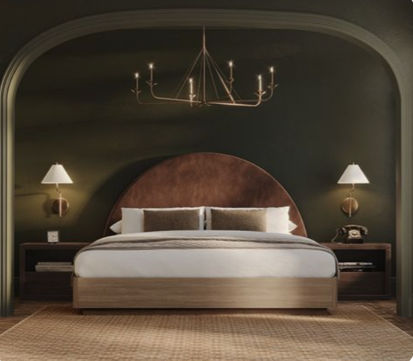 make the back wall a subtle turquoise color with a rattan natural large chandelier and palm wallpaper in the arch of the back bed wall