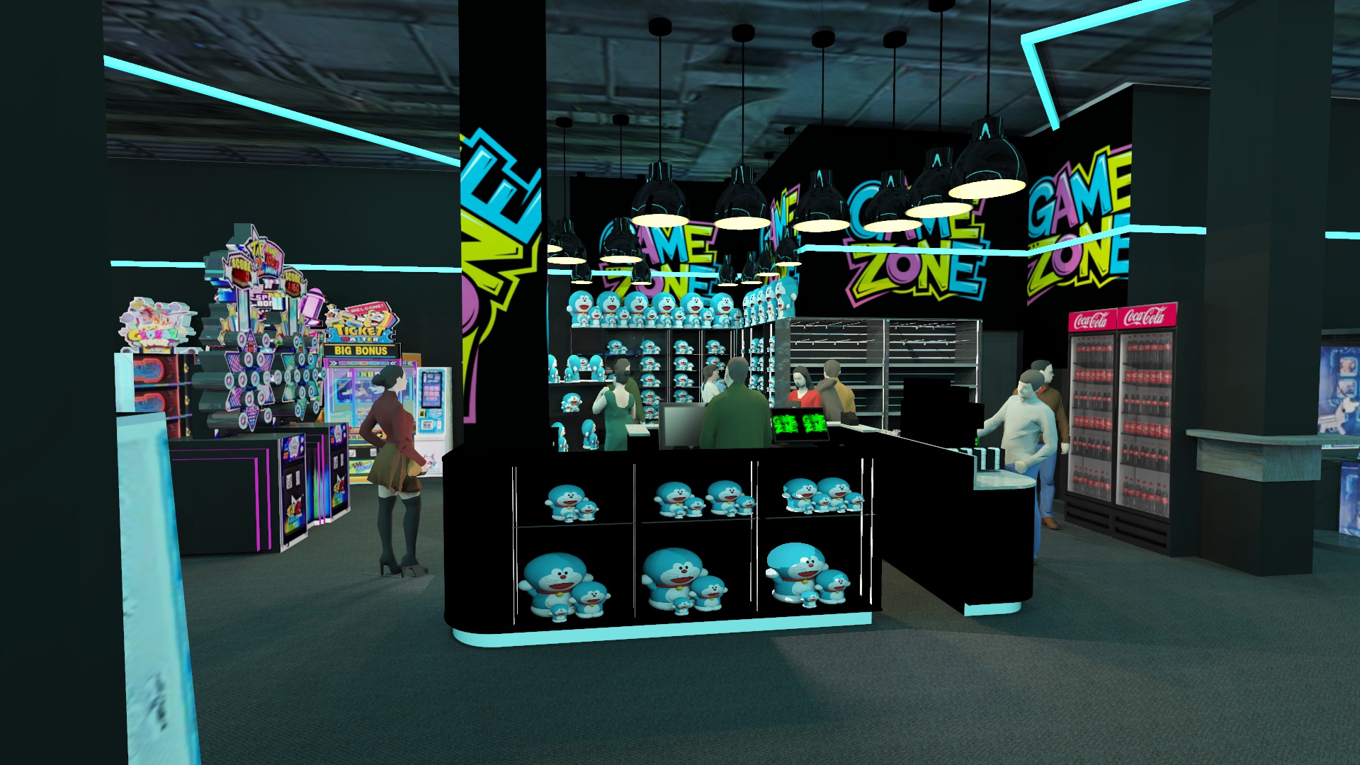 an arcade and gaming hall the machines glow brightly black walls and a black ceiling the floor covered in dark gray carpet turquoise light lines on the ceiling and turquoise lighting under the furniture create a photorealistic effect