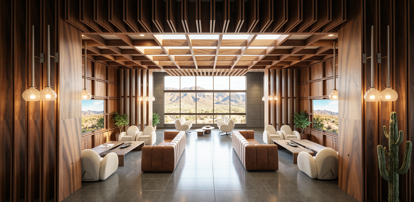 make this look photorealistic add a little view of parking with cars a sidewalk light landscaping and make the siding on the two larger building metal vertical siding a light gray and the left side building glass walls with stucco on the soffits leave space outside for outside volleyball courts add roots volleyball academy to the side and front midday