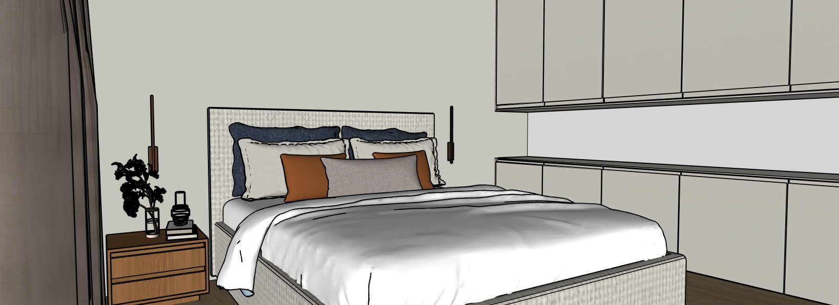 master bedroom elegante coz e moderno parede atras da cama pintada na cor light green gray armario lateral de apoio no cor branco com iluminacao de led roupa de cama nos tons de beige e no material elegante com linho decoracao no movel lateral branco com itens delicados para deixar o querto ainda mais bonito