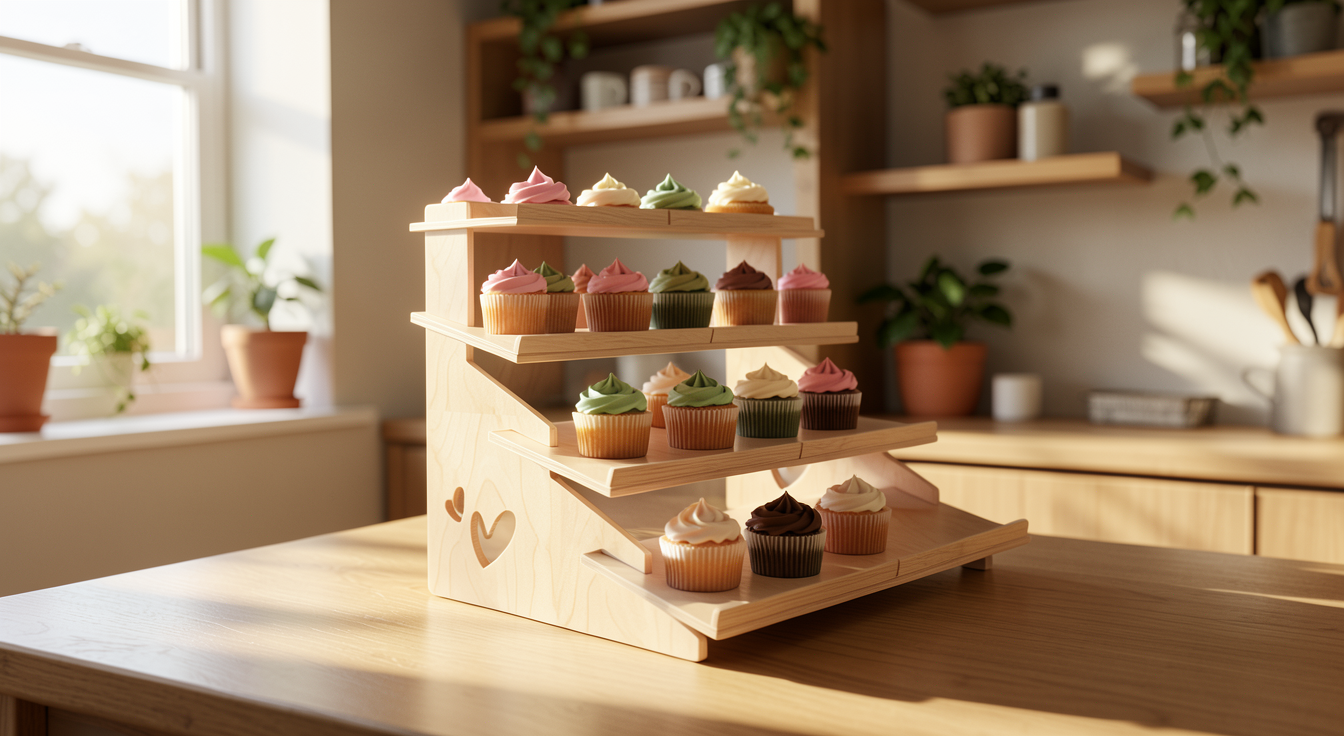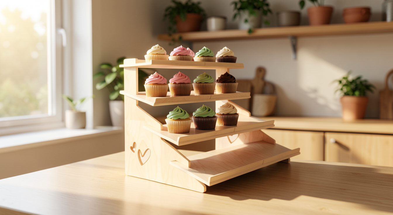 cupcake stand on a wooden counter cupcakes displayed on the stand shelves soft pastry shop in the background