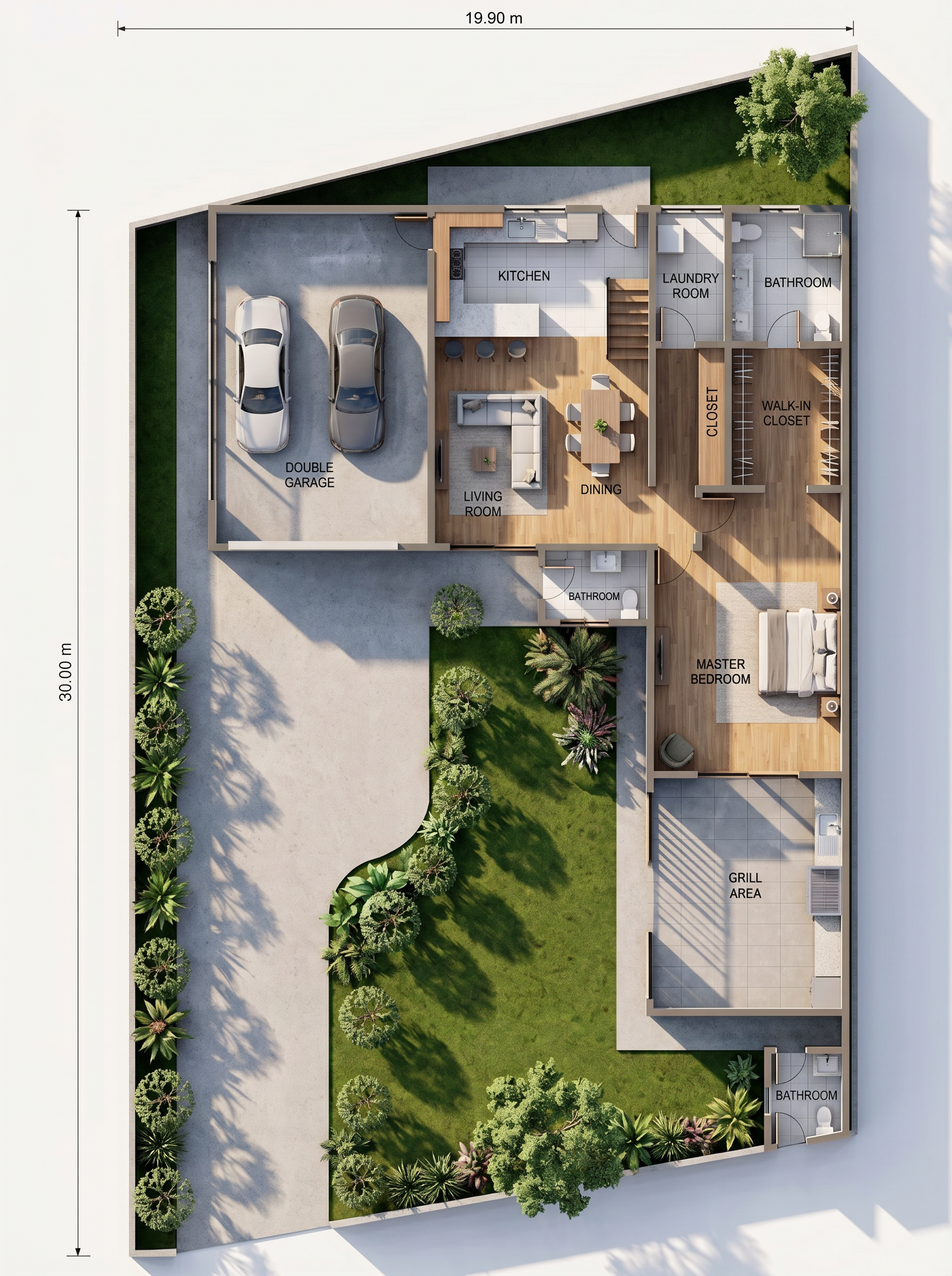 modern exterior shot dark grey fascia black glass garage doors grey brick exterior dark grey stucco modern siding modern driveway with lush green grass and trees modern flowers architecture